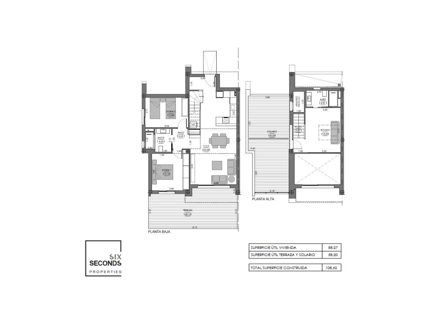 Discover these elegant, newly built semi-detached houses in an exclusive residential complex, located in one of the most privileged areas of the Costa Blanca South , within the prestigious La Finca Resort , an environment that combines nature, tranquility, and a premium lifestyle . The property is distributed over two floors with an intelligent layout designed to offer maximum comfort and functionality . On the ground floor, a bright living-dining room flows seamlessly into the designer kitchen with a breakfast bar , creating an ideal space for everyday living and entertaining. From the living room, there is direct access to a spacious private garden with a swimming pool , perfect for enjoying the Mediterranean climate year-round. Also on this floor are two bedrooms and a full bathroom , equipped with underfloor heating , a shower with a full glass enclosure , a sink, and a mirror. The upper floor houses the master bedroom , which offers panoramic views , an en-suite bathroom , and direct access to a private solarium , an exclusive space for relaxing in complete privacy. All bedrooms have large built-in wardrobes .