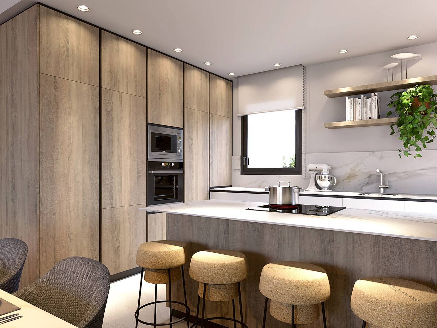 The ground floor comprises three bedrooms , one with a dressing room and en-suite bathroom , and the others with built-in wardrobes . All three bathrooms are fully equipped with underfloor heating , full shower enclosures, sinks, and mirrors, ensuring maximum comfort. The state-of-the-art kitchen , in elegant earth tones , offers top-quality materials , ample storage with floor-to-ceiling cabinets , and an open-concept design that seamlessly integrates with the living room, maximizing natural light throughout. The living room provides direct access to the private garden , where a spacious terrace with a built-in pergola and a private swimming pool create the perfect setting to enjoy the Mediterranean climate with family and friends.
