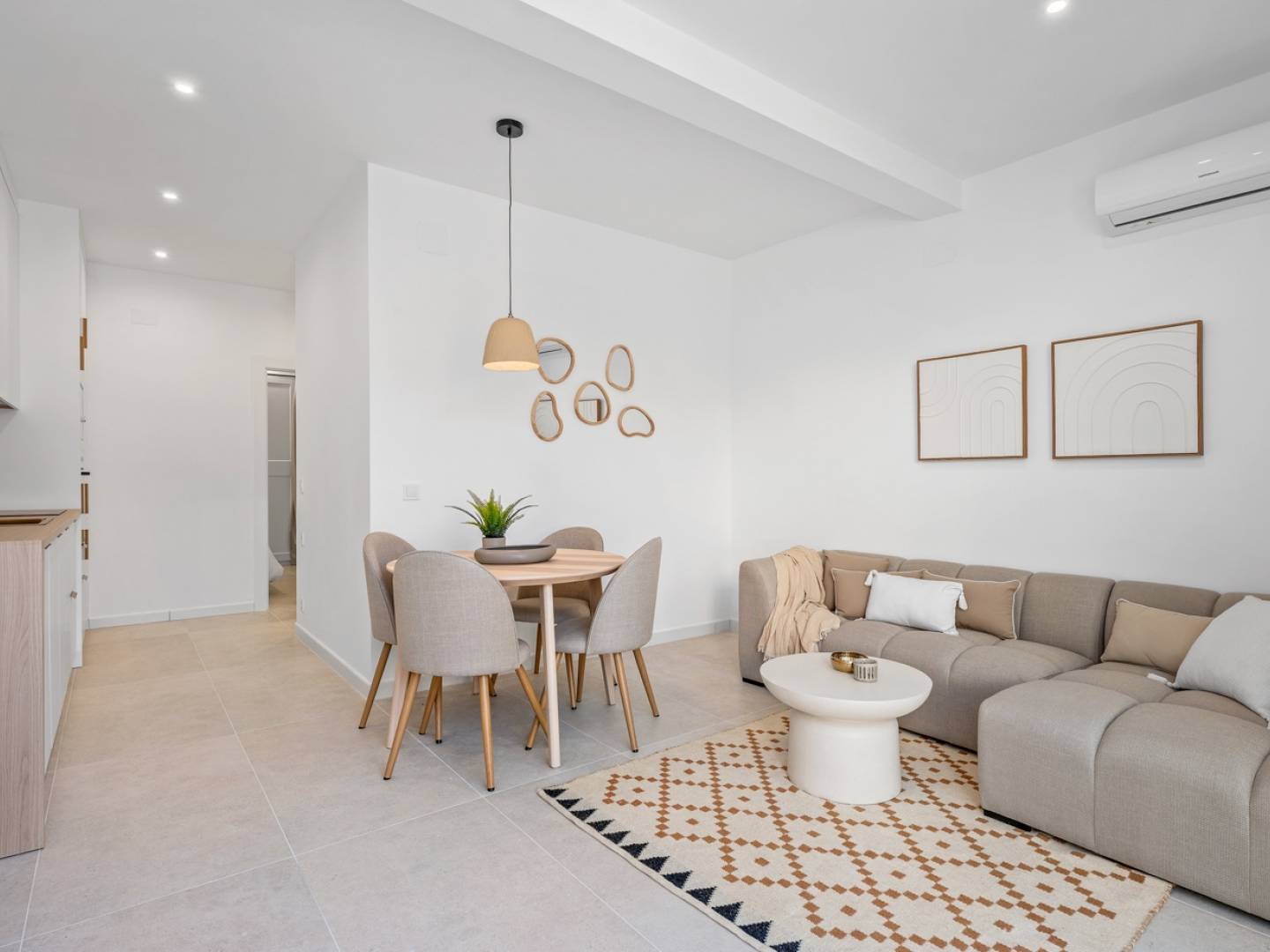 Modern and bright 59 m² property, recently renovated, featuring a carefully designed contemporary style with neutral finishes that enhance warmth and spaciousness.The layout offers 2 bedrooms, one full bathroom, and a pleasant open-plan livingdining area with a fully equipped integrated kitchen. The kitchen opens onto the living area, creating a functional and welcoming space ideal for everyday living.The living room connects directly to a private terrace, perfect for outdoor breakfasts or relaxing moments, and features large windows that ensure excellent natural light throughout the day. The private area includes a main bedroom with built-in wardrobes, a versatile second bedroom, and a separate laundry area, adding comfort and organization to the home. Outside, the property is located in a quiet residential setting with independent street access. An external staircase leads to a spectacular rooftop solarium, ideal for sunbathing, enjoying open views, or creating a chill-out area.