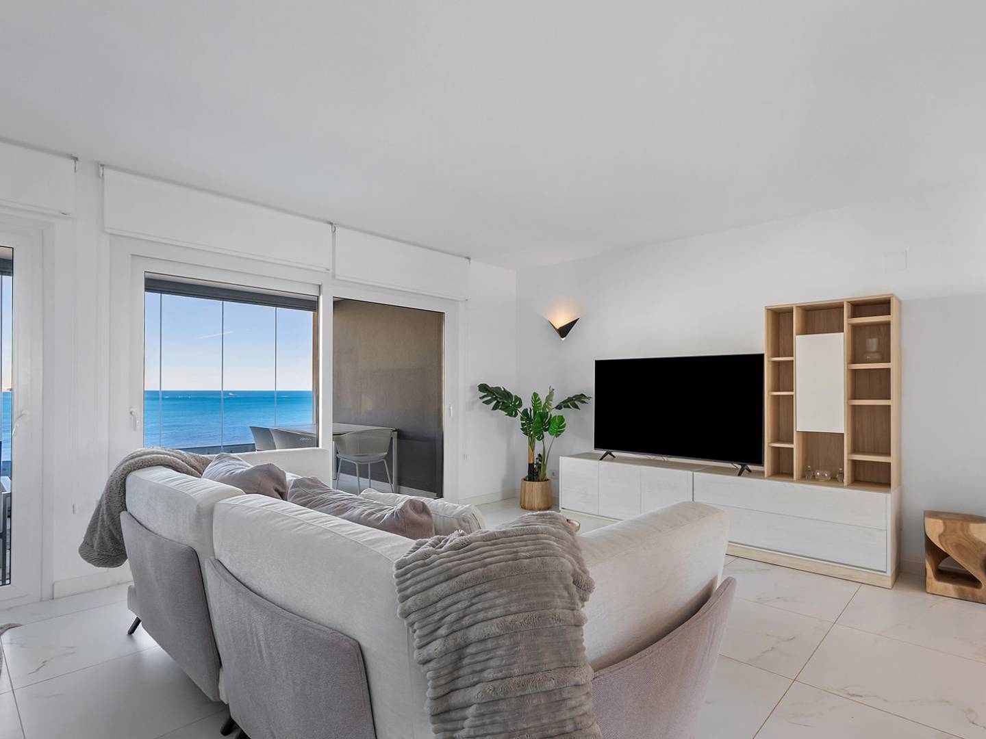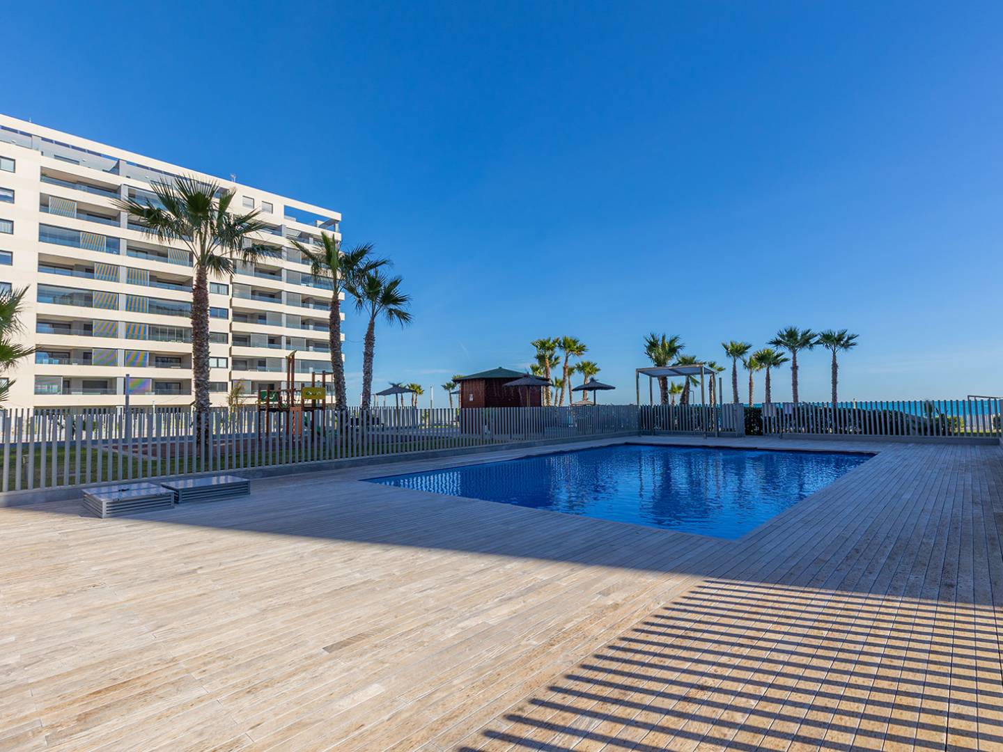This exclusive 5th-floor apartment is located in the prestigious Posidonia residential complex, on the seafront in Punta Prima. Originally designed with three bedrooms, the property was modified off-plan to offer 94 m² of pure comfort, now distributed into two spacious bedrooms and two bathrooms, gaining exceptional spaciousness in the living areas. Its key strength lies in its double orientation and outdoor spaces: a 16 m² terrace with unobstructed views of the sea and the bay of Torrevieja, and a second 12 m² rear terrace facing south with views towards La Manga, guaranteeing sun, natural light, and cross ventilation throughout the day. The property is sold fully furnished, with an underground parking space and storage room included. The complex features high-standard common areas and security. Located within walking distance of amenities, supermarkets, and coves, it is approximately 45 minutes from Alicante Airport, combining luxury and comfort in one of the most sought-after areas of the Costa Blanca.