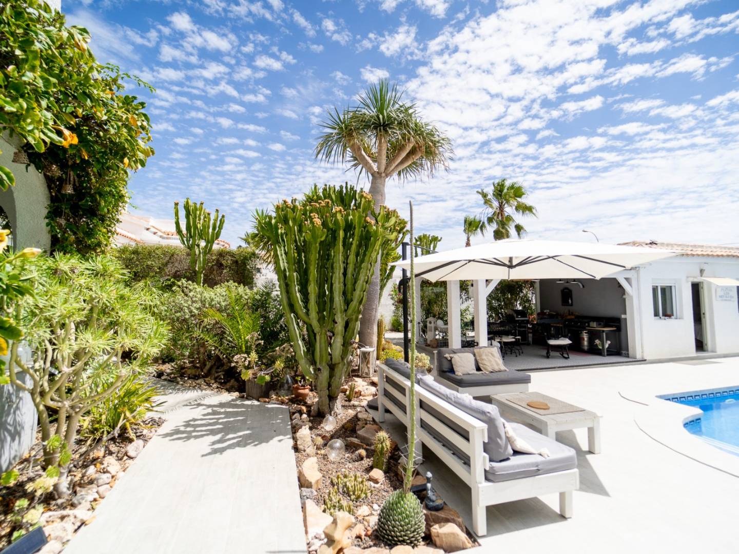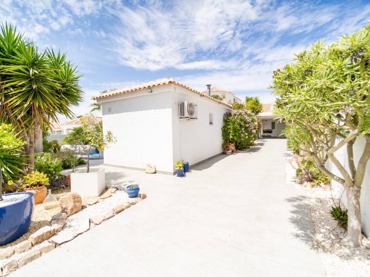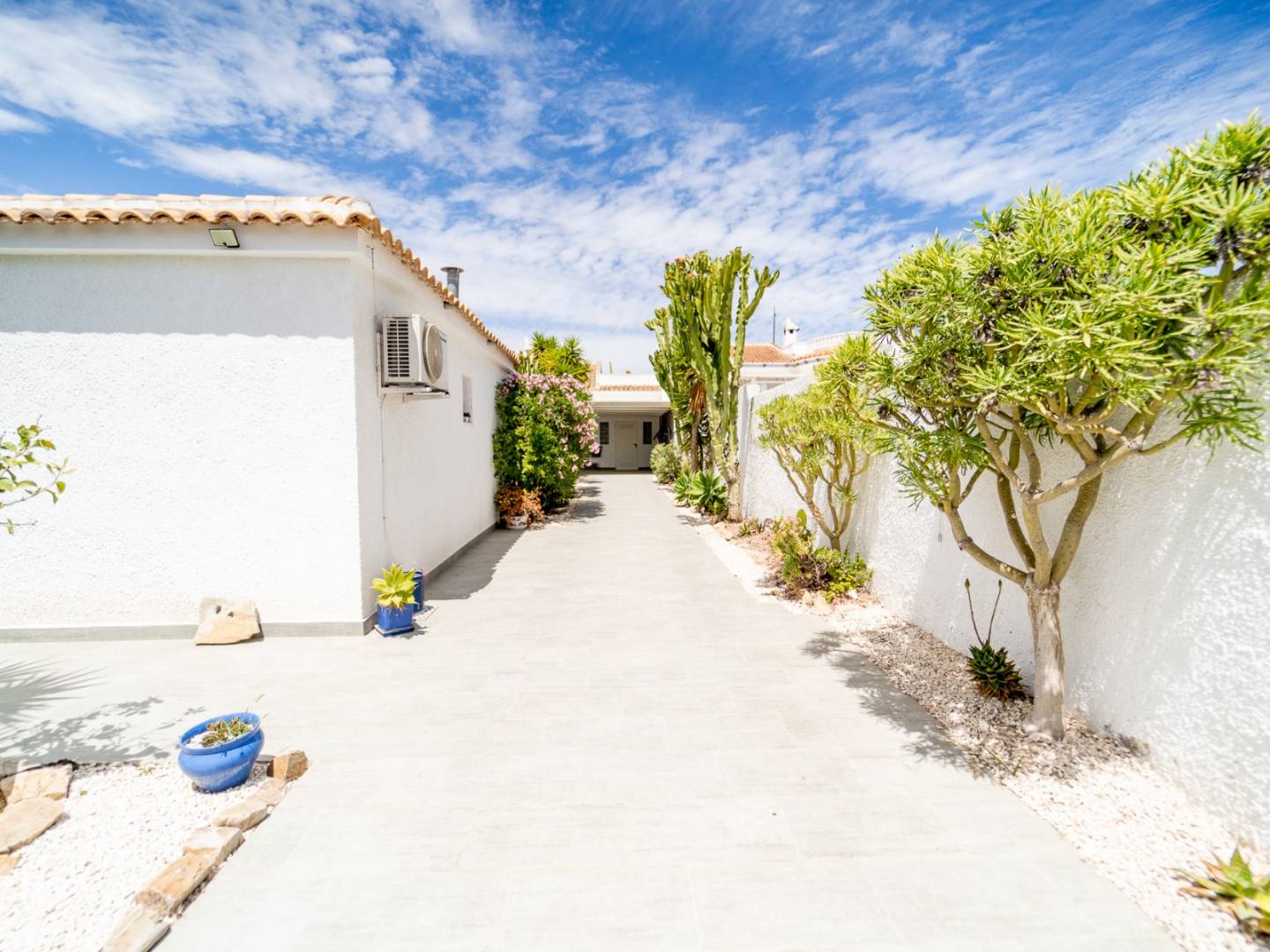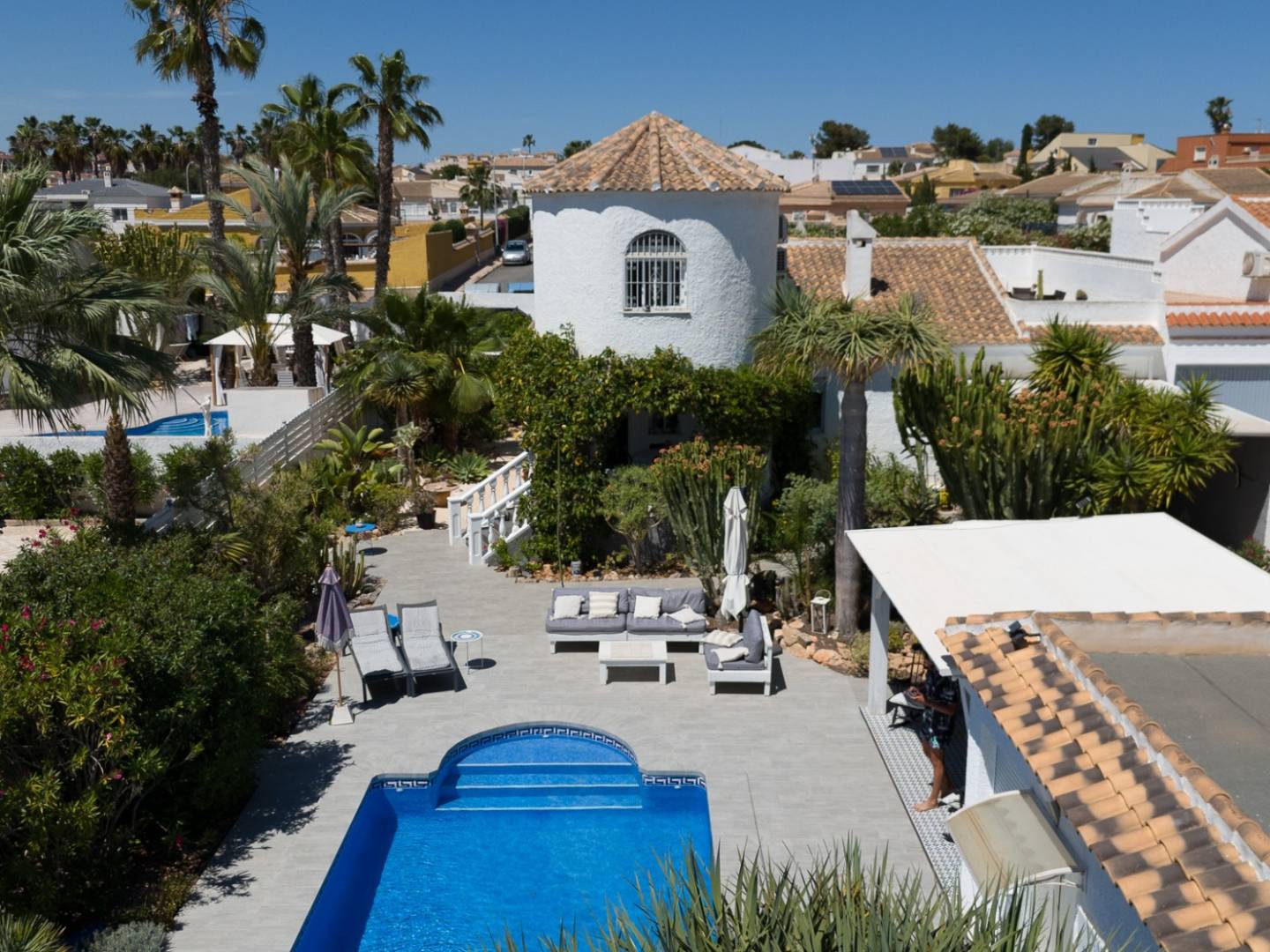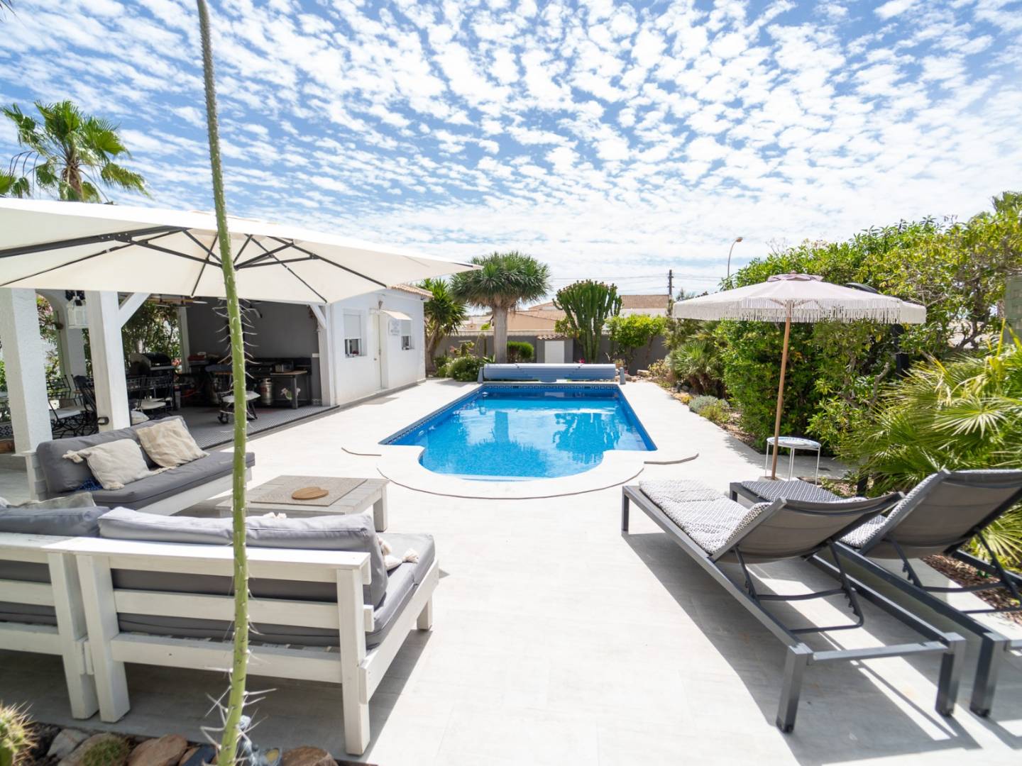 Discover this magnificent renovated villa located in the prestigious and tranquil area of La Siesta, Torrevieja , a property that combines elegance, privacy, and quality of life under the Costa Blanca sun. With 140m² of living space on a spectacular 966m² plot , this home offers four spacious bedrooms and three full bathrooms , designed for enjoying time with family and guests. Its 31m² private swimming pool is the true heart of the house, surrounded by a garden, terrace, and barbecue area , ideal for year-round outdoor leisure. The property features a fully equipped kitchen with state-of-the-art appliances , a private garage , and a comprehensive security and comfort system including heating, double glazing, an alarm system, and a video intercom . Located just 6 km from the beaches , with a bus stop 600m away , essential services nearby , and Alicante Airport 40 km away , this villa offers a privileged location in a well-established, family-friendly, and easily accessible residential area . A unique opportunity for those seeking design , space and tranquility in one of the most sought-after areas of the province.