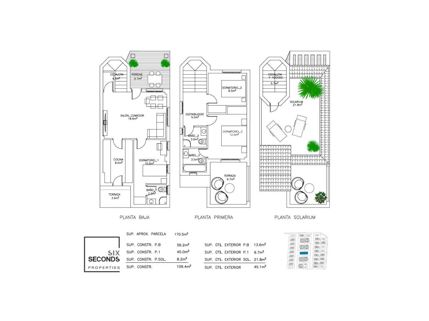 Discover this wonderful development of nine homes in an elegant residential complex in San Fulgencio , one of the most convenient and well-connected areas on the Costa Blanca , ideal for both permanent residence and investment. Each property offers three bedrooms , three bathrooms , a spacious and bright living room , and a separate kitchen , designed for comfort and privacy. Outside, the homes boast two ground-floor terraces , a second-floor terrace , and a spectacular private rooftop solarium , perfect for enjoying the Mediterranean climate year-round.