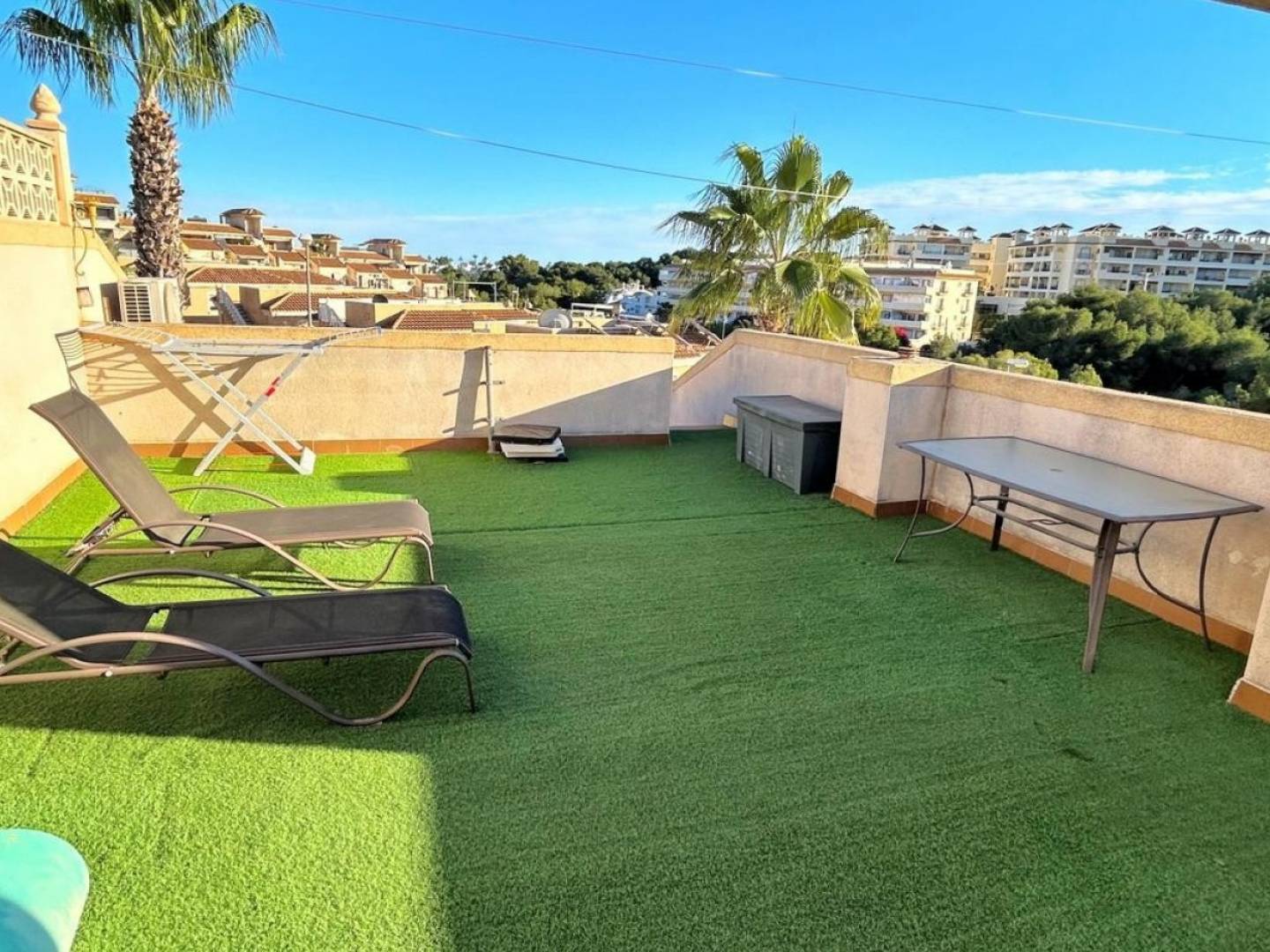 Located in the highly sought-after Monte Golf Urbanisation, this beautifully maintained corner townhouse offers generous living spaces, excellent outdoor areas, and a prime location—perfect as a permanent residence, holiday home, or investment. The property enjoys a privileged corner position with a private garden designed for both relaxation and low maintenance. The outdoor space features decorative pebble areas, mature trees, lush plants, and a newly built decorative wall that ensures privacy. A private driveway with an electric vehicle charging point adds modern convenience and future-ready living. Inside, the home is thoughtfully laid out across two levels: Upper Floor Two bright and comfortable bedroomsFully refurbished modern kitchen with a large American-style fridgeCharming dining areaStylish bathroom Ground Floor Spacious and welcoming living roomTwo additional bedrooms (one currently used as a home office)BathroomDirect access to a sunny terrace and the garden, where a hot tub jacuzzi creates the perfect space for relaxing or entertaining guests The townhouse is part of a peaceful and well-kept community with access to two attractive communal swimming pools, ideal for enjoying the Mediterranean climate. The location is exceptional, just minutes from La Fuente Commercial Center with Mercadona, restaurants, and bars, as well as Villamartín Plaza and the renowned golf course. The beautiful beaches of La Zenia, Cabo Roig, and Campoamor are only a 15-minute drive away. The home is sold fully furnished and tastefully decorated, reflecting the care and attention of the current owners—ready to move in and enjoy immediately. Contact us today to arrange your viewing and experience the Villamartín lifestyle firsthand.