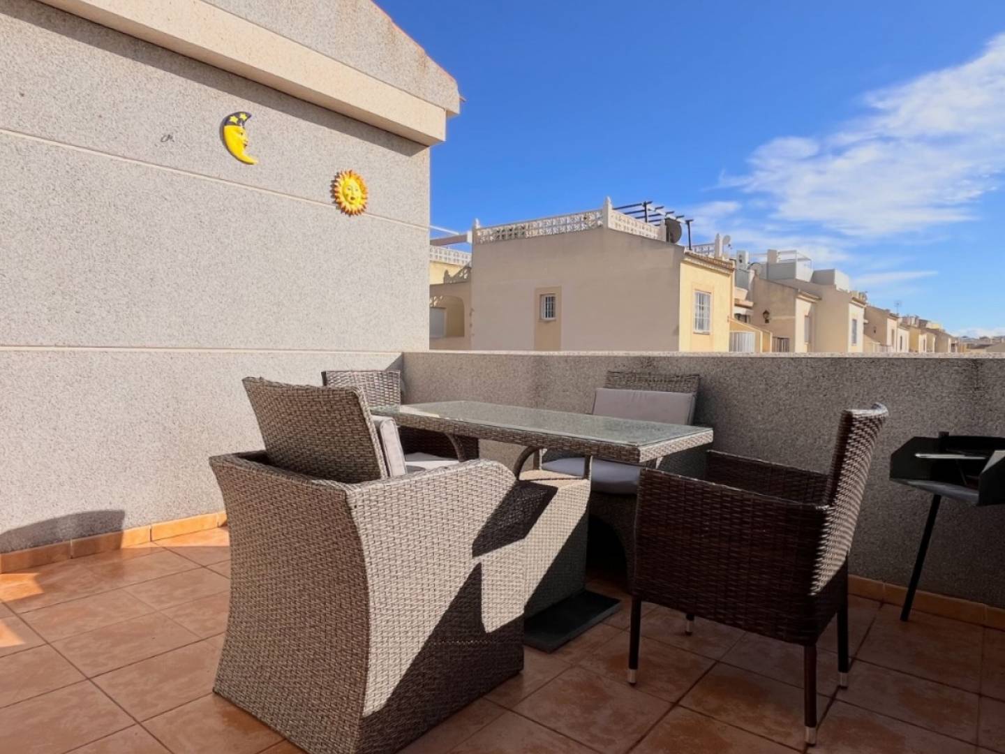 Welcome to this charming and fully ready-to-live semi-detached house located on Calle Rodrigo, 36, in the desirable La Siesta - El Salado - Torreta neighbourhood of Torrevieja. This thoughtfully updated home offers comfort, outdoor living, and flexible use — ideal as a permanent residence, holiday retreat, or rental investment. Key Features: Spacious interior spread over two levels with a functional layout. Three bedrooms with built-in wardrobes and two bathrooms, including one on the ground floor beside the laundry area. Bright, open-plan living area offering flexible space for relaxing and entertaining. A fully equipped kitchen with both electric and gas cooktops and prepared plumbing for a dishwasher. Air conditioning throughout for year-round comfort. Outdoor Living: Private entrance terrace complete with outdoor furniture, storage shed, and an outdoor shower — perfect after a day at the beach or exploring the nearby nature. On the upper level, enjoy a large balcony with a built-in barbecue area, covered dining space, park views, and a retractable awning for shade on warm days. Location Highlights: Just a minutes walk from Parque Natural de La Mata — ideal for walking, cycling, and enjoying wildlife. Around 10 minutes on foot to sports facilities, restaurants, pharmacy and everyday services. A short drive to beaches, shopping centres, and supermarkets, offering a great blend of peaceful surroundings and convenient access. This property stands out for its move-in readiness, outdoor lifestyle spaces, and practical layout — a rare find in a quiet yet well-connected part of Torrevieja.