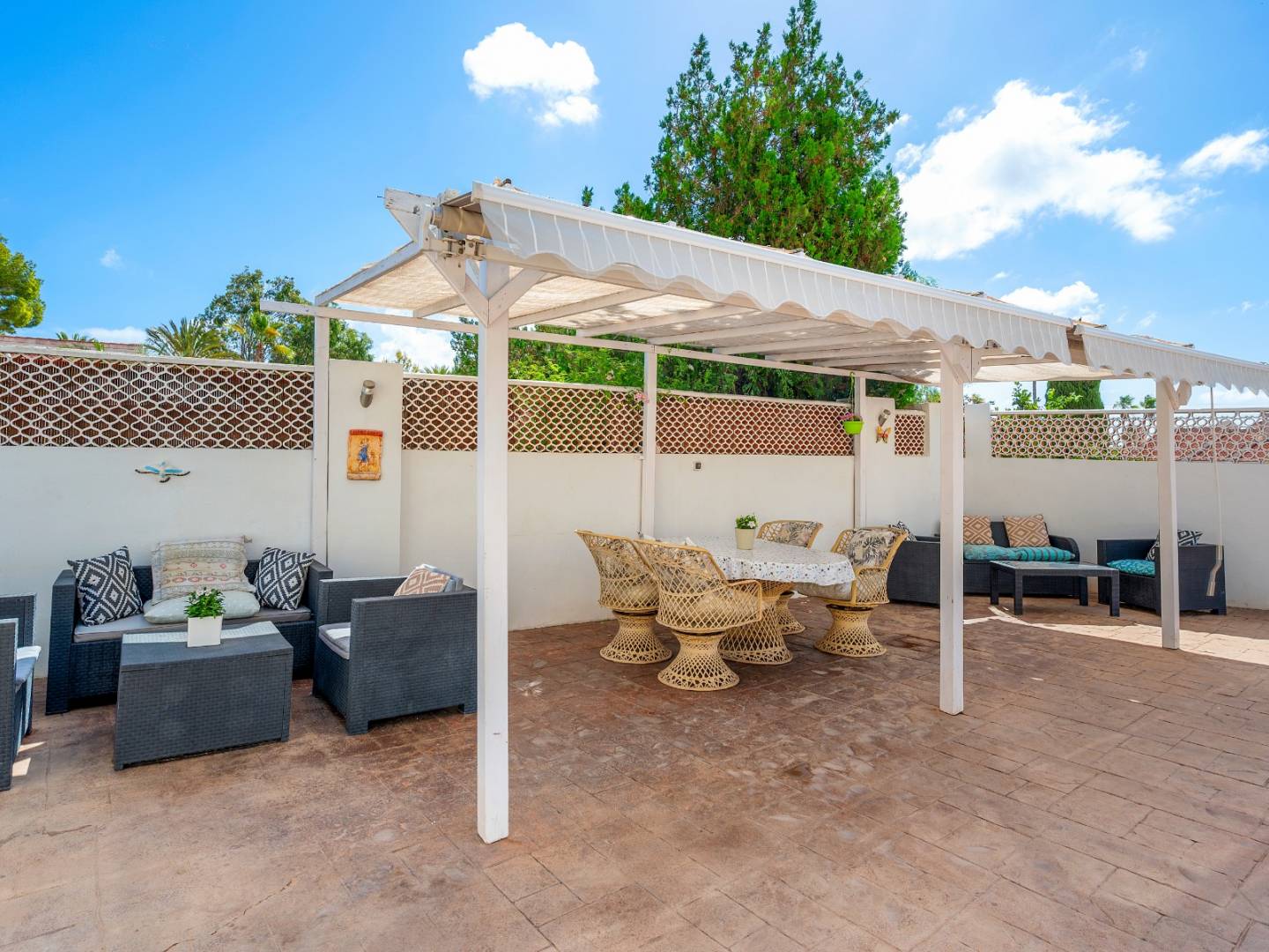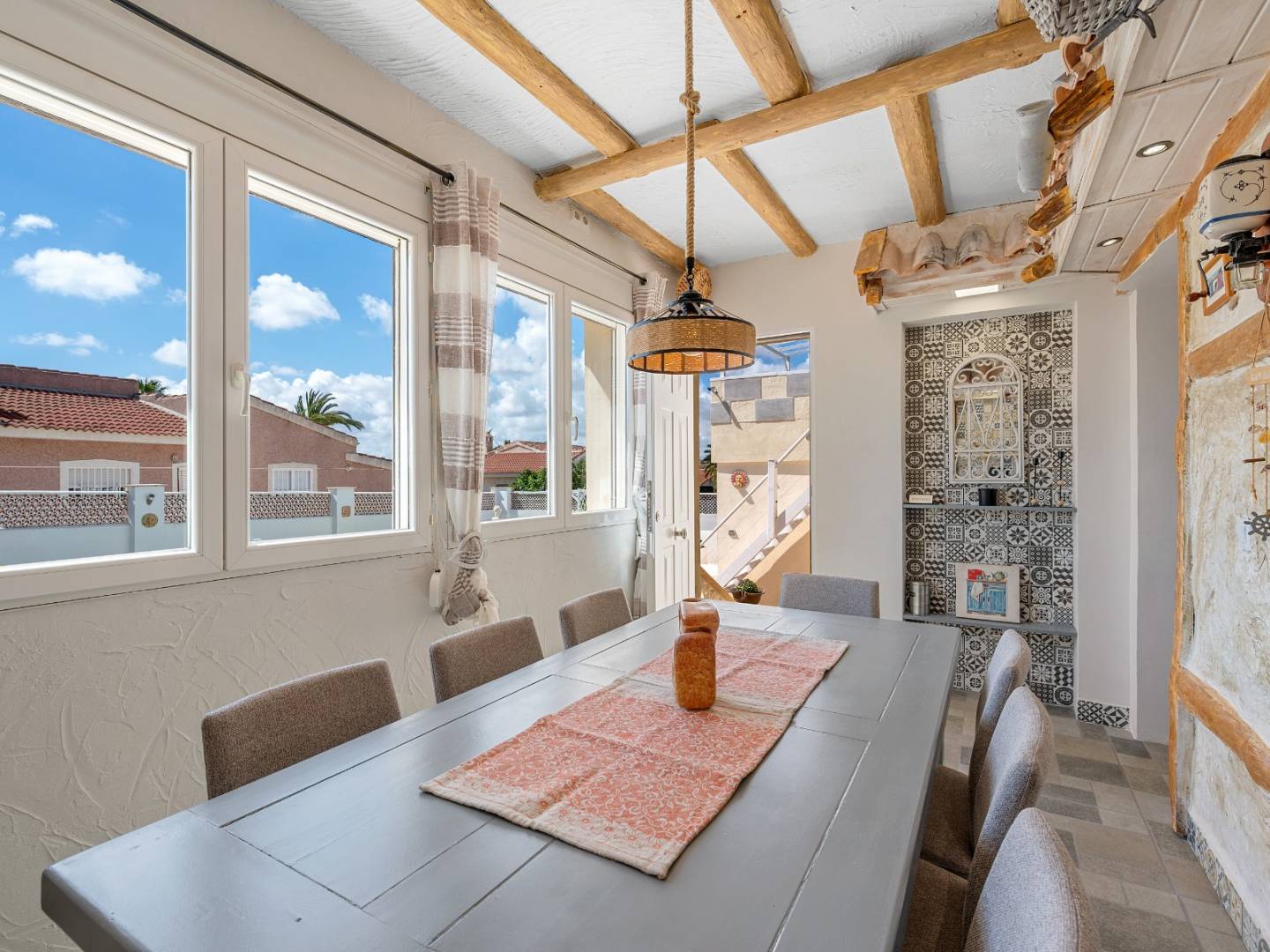 This detached apartment , with its private entrance , two bedrooms , one bathroom , and direct access to the pool area , is perfect for guests or generating additional income. Above it is a large sun terrace with panoramic views of the Torrevieja salt lagoons , a truly unique feature. Outside, the property offers a private and well-maintained area with an 8 x 4 meter swimming pool , relaxation areas, a barbecue, and parking for two vehicles with an electric gate .