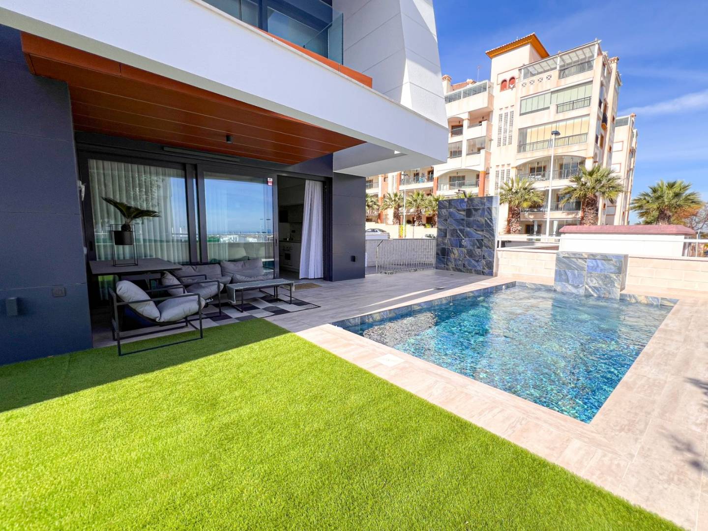 The modern open-concept kitchen integrates with a bright living room that gives direct access to the private pool , where we find a pleasant chill-out area and an outdoor dining space , perfect for enjoying the Mediterranean climate all year round.