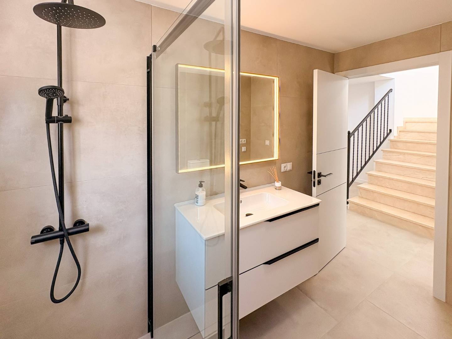 The first floor houses the master bedroom , a second bathroom with a shower , and two terraces , one facing northwest and the other southwest , allowing you to enjoy the sun throughout the day. The villa's southwest orientation ensures pleasant natural light for much of the day.