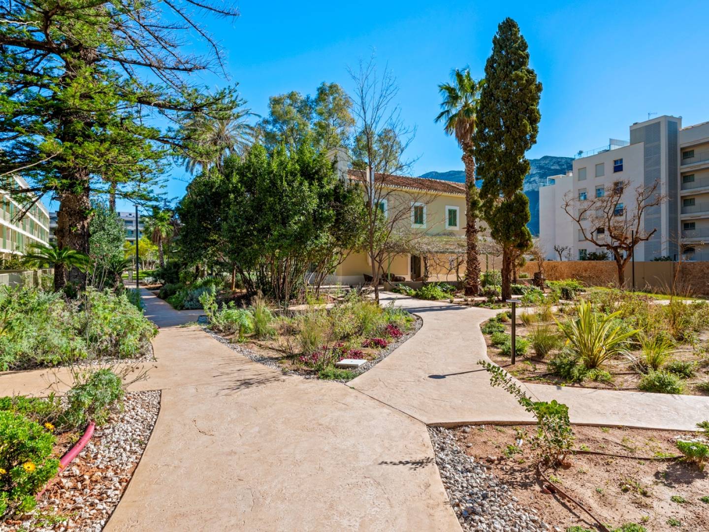 Apartment with 2 spacious bedrooms and a large living room with an open-plan kitchen, 2 bathrooms, located in an exclusive residential complex in Dénia, just 200 m from the beach. The apartment is finished but unfurnished. The kitchen is equipped with Siemens appliances: oven, microwave, and induction hob. A refrigerator and dishwasher need to be purchased separately. The bedrooms feature built-in wardrobes. There is also a dedicated laundry space and a utility/storage cupboard in the hallway. The residential complex is unique, situated within a historic park with mature, lush greenery. Residents have access to the following amenities within the complex: concierge serviceswimming poolchildrens poollandscaped gardensco-working spacegymmultipurpose room for events and gatheringsunderground parkingprivate storage room The apartment has a west-facing orientation with views of the sea and the port. The area is quiet, very green, with low-rise residential buildings of up to three floors. Distances: Beach 300 mMasymas grocery store 300 mHistoric centre of Dénia 900 m