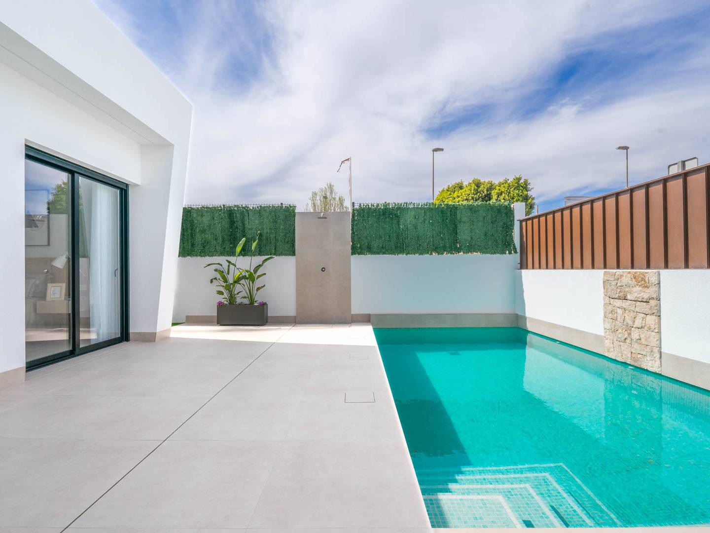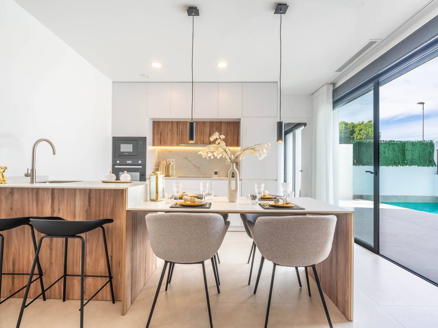 The exteriors of these independent homes are designed to fully enjoy the Mediterranean climate. Each property features a private garden, perfect for creating a personal oasis of tranquility. Additionally, the homes have a terrace and solarium, ideal for outdoor relaxation or gatherings with friends and family. The inclusion of a private pool in each home adds a touch of luxury and exclusivity, allowing for refreshing dips on the hottest days. Access to a private garage ensures the convenience and security of vehicles.