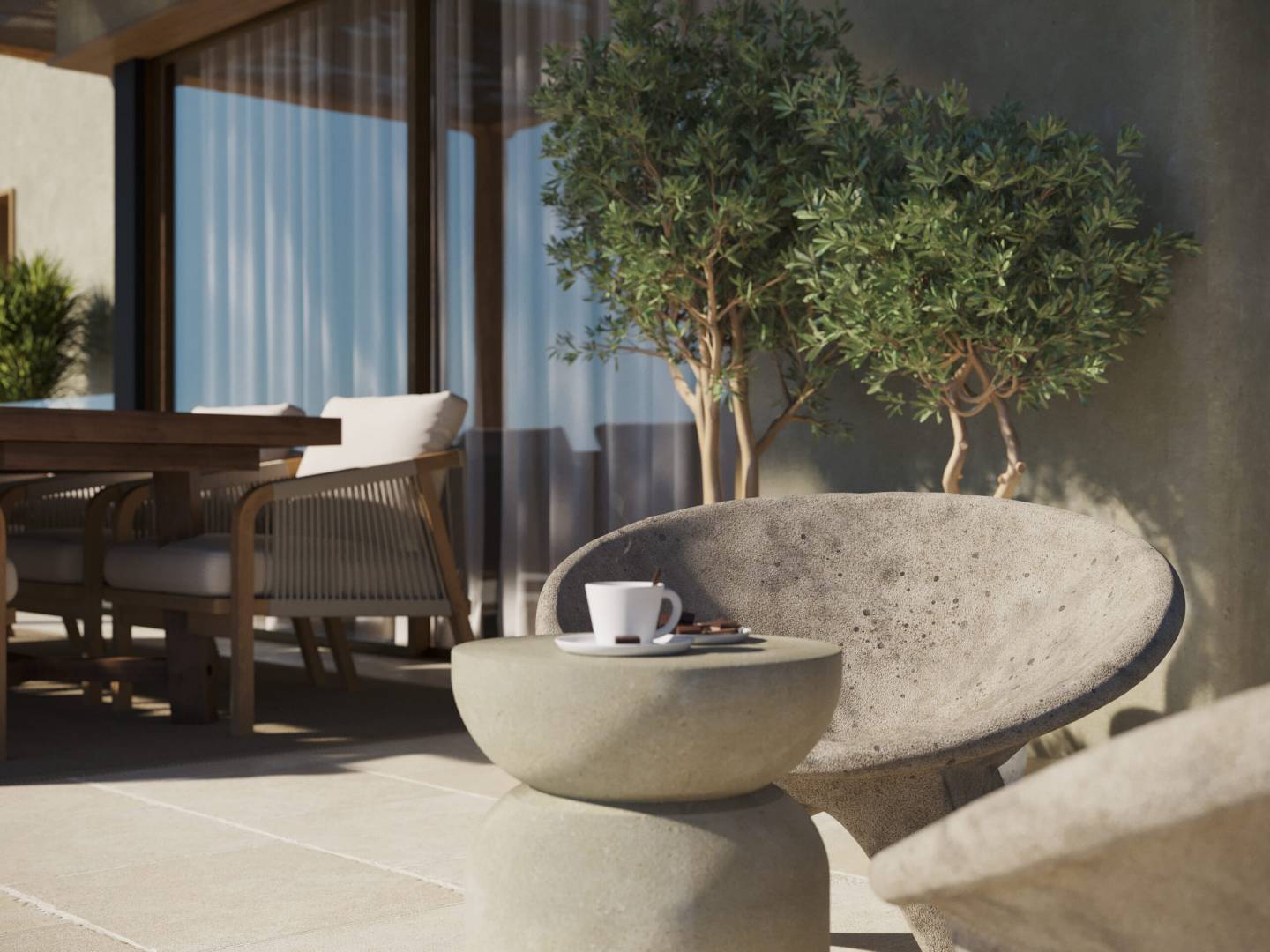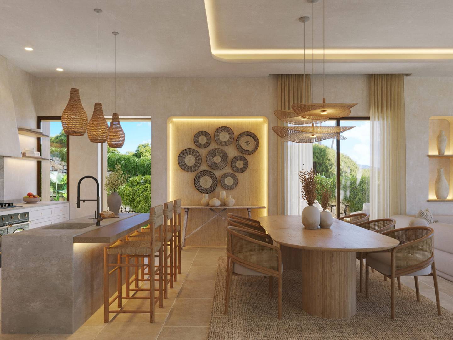 The interior of the villa is designed with a focus on comfort and modernity. Microcement floors add a contemporary touch and are easy to maintain, while electric shutters offer convenience and security. The villa is equipped with modern appliances, ensuring that all daily needs are met efficiently. The air conditioning system ensures a cool environment during the summer months, while underfloor heating provides warmth and comfort in winter. The layout includes a garage, adding an extra level of convenience and security for vehicles.