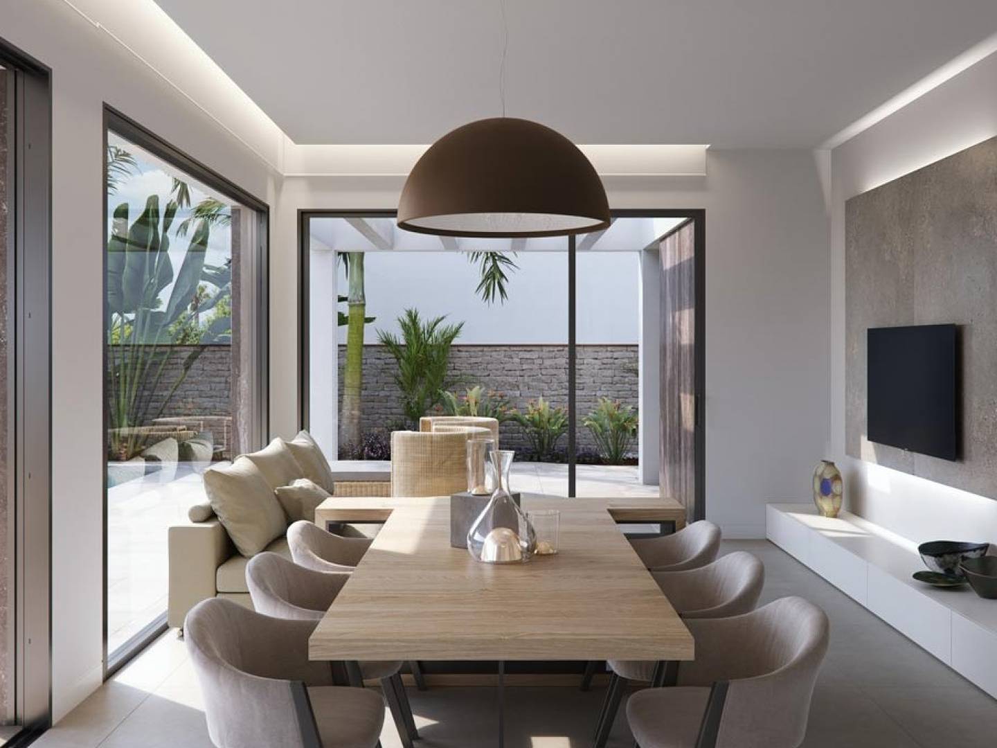 The exterior design of the villas includes a private garden that offers a perfect space for enjoying the outdoors. The terrace is ideal for relaxing or hosting outdoor gatherings. Additionally, each villa features a solarium, providing additional space to enjoy the sun and the views of the surroundings. The presence of a garage ensures convenience and security for vehicle parking.