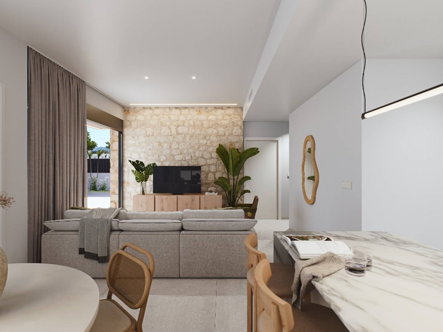 The exterior of these independent homes is a true oasis of tranquility. Each property features a private garden, perfect for enjoying the Mediterranean climate. Additionally, they have a spacious terrace and a solarium, ideal for relaxing or entertaining guests. The presence of a private pool adds a touch of luxury, allowing for a refreshing swim in the comfort of home. These outdoor features are designed to maximize enjoyment of the natural surroundings and offer a quality outdoor space.