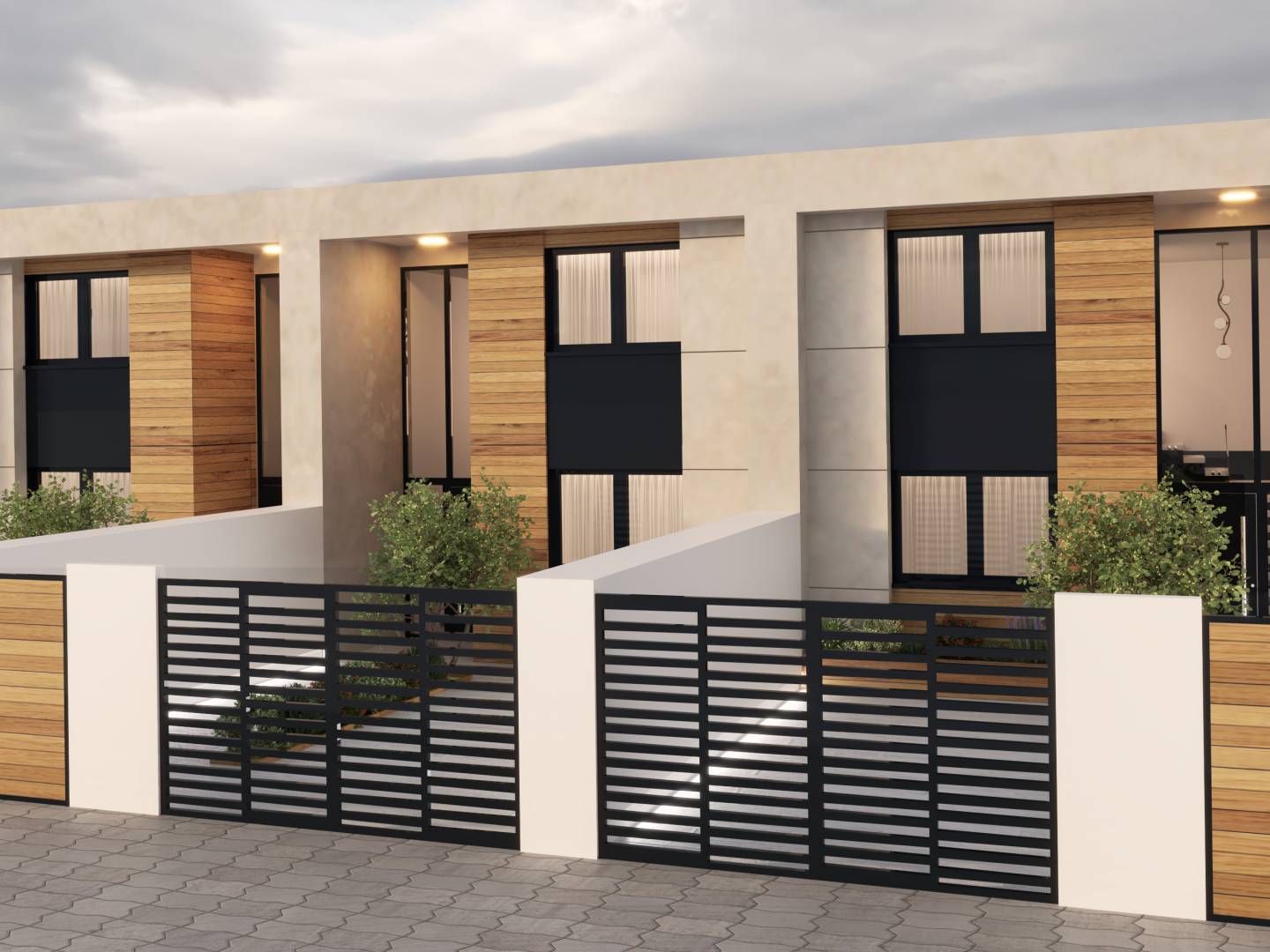 The interiors of these townhouses are carefully designed to offer a cozy and functional environment. With a layout that includes three bedrooms and three bathrooms, each space is optimized for the comfort of its residents. Porcelain tile floors add a touch of elegance and are easy to maintain. The inclusion of modern appliances and built-in wardrobes ensures that each home is ready to be lived in with all necessary comforts. Additionally, the video intercom provides extra security and convenience, allowing efficient control of access to the home.