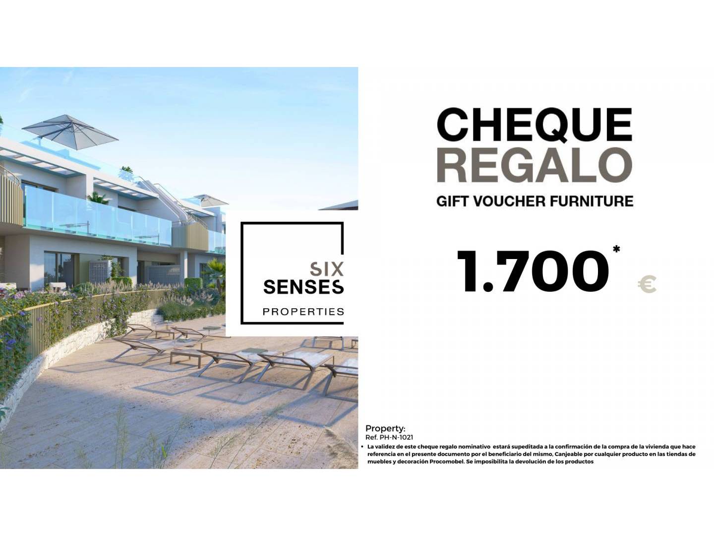 At Six Seconds Properties we help you to turn your new property into the home of your dreams, giving you a gift voucher for €1700 worth of furniture and a technical visit of the property, where our technical team will advise you on the possibilities of improving the property. Totally free of charge!