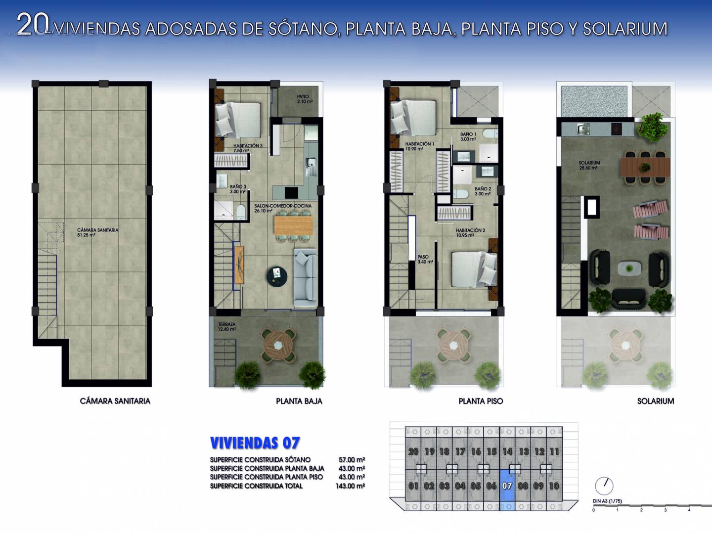 The outdoor spaces of these townhouses in Dolores are designed to maximize enjoyment of the Mediterranean climate. Each home features a private terrace, a perfect space to enjoy outdoor moments, whether relaxing, sharing with friends, or simply enjoying a dinner under the stars. Additionally, the solarium is a standout feature, providing additional space for sunbathing or creating a small urban garden. The exterior architecture harmoniously integrates with the surroundings, offering a modern design that complements the natural beauty of the area.