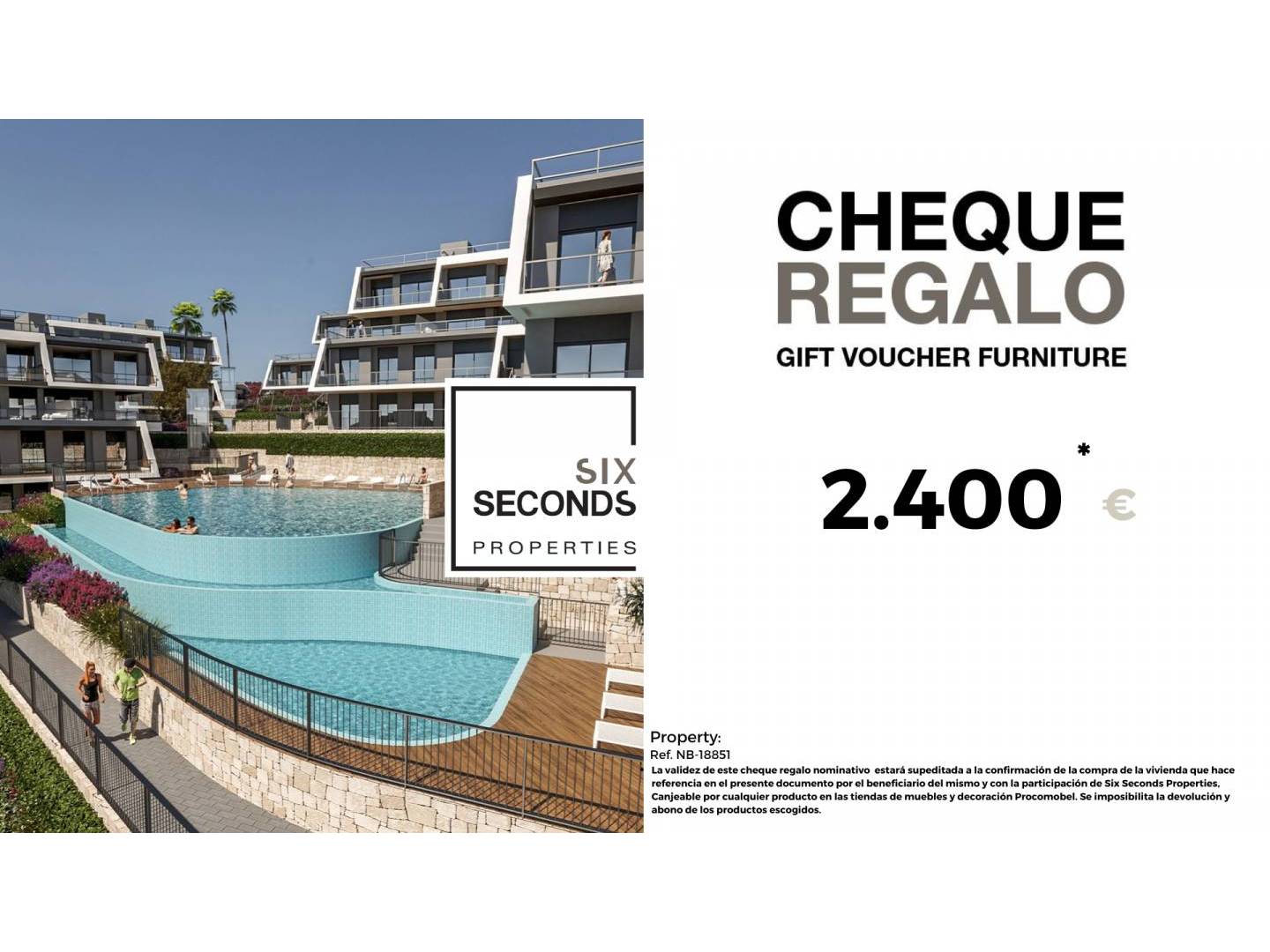 At Six Seconds Properties, we help you transform your new property into your dream home by giving you a €2,400 furniture gift voucher and a free property inspection , where our technical team will advise you on potential improvements. Completely free!