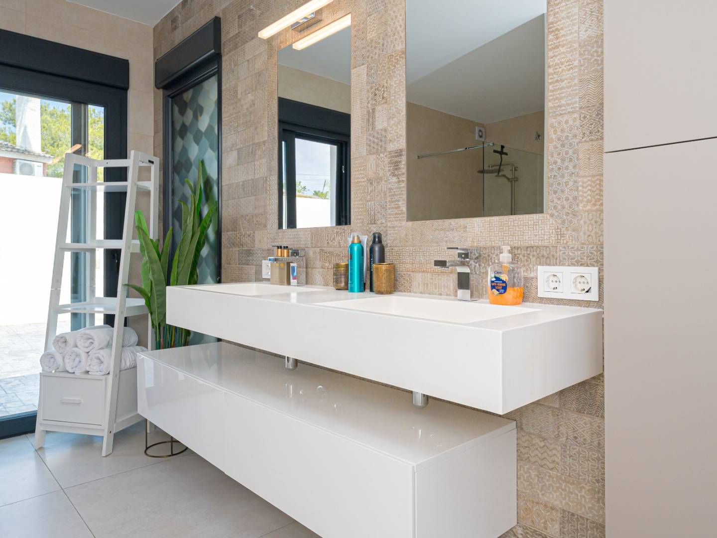 The property stands out for its contemporary architecture and functional layout , featuring 5 bedrooms , 4 full bathrooms , and 1 guest toilet . All rooms enjoy abundant natural light thanks to large windows and high ceilings that create a sense of spaciousness and elegance. Two of the bedrooms and one bathroom have a separate entrance , forming an apartment of approximately 38 m² , ideal as guest accommodation, an office, or a private studio.