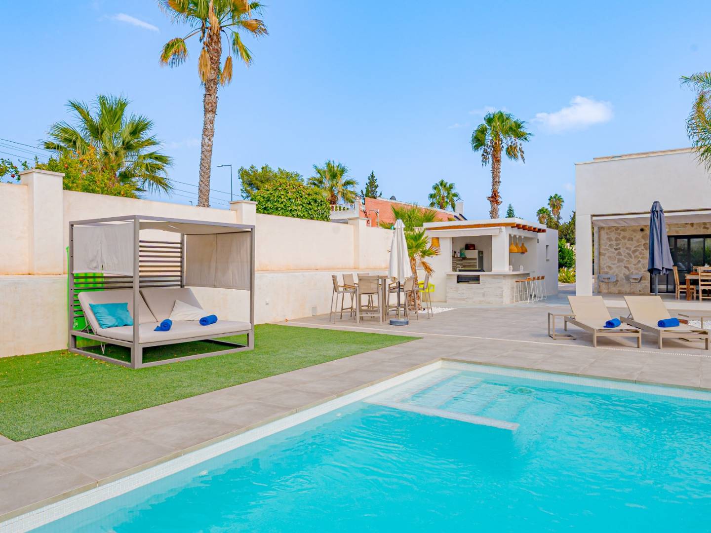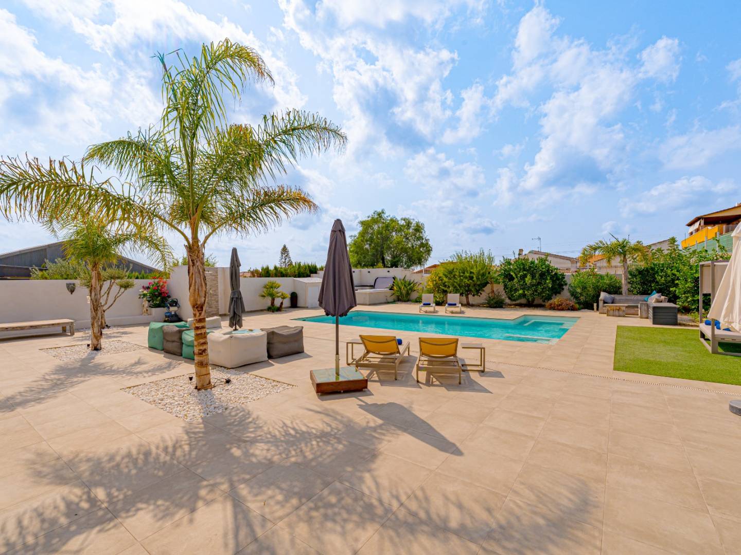 The exterior of the property is a true private oasis designed for enjoyment. It features a large private pool , outdoor shower , jacuzzi , spacious terraces, and a sunbathing area surrounded by palm trees and fruit trees. An elegant Mediterranean-style beach bar with a summer kitchen, barbecue, and storage room , which also includes a full bathroom , completes this perfect space for gatherings and leisure time.