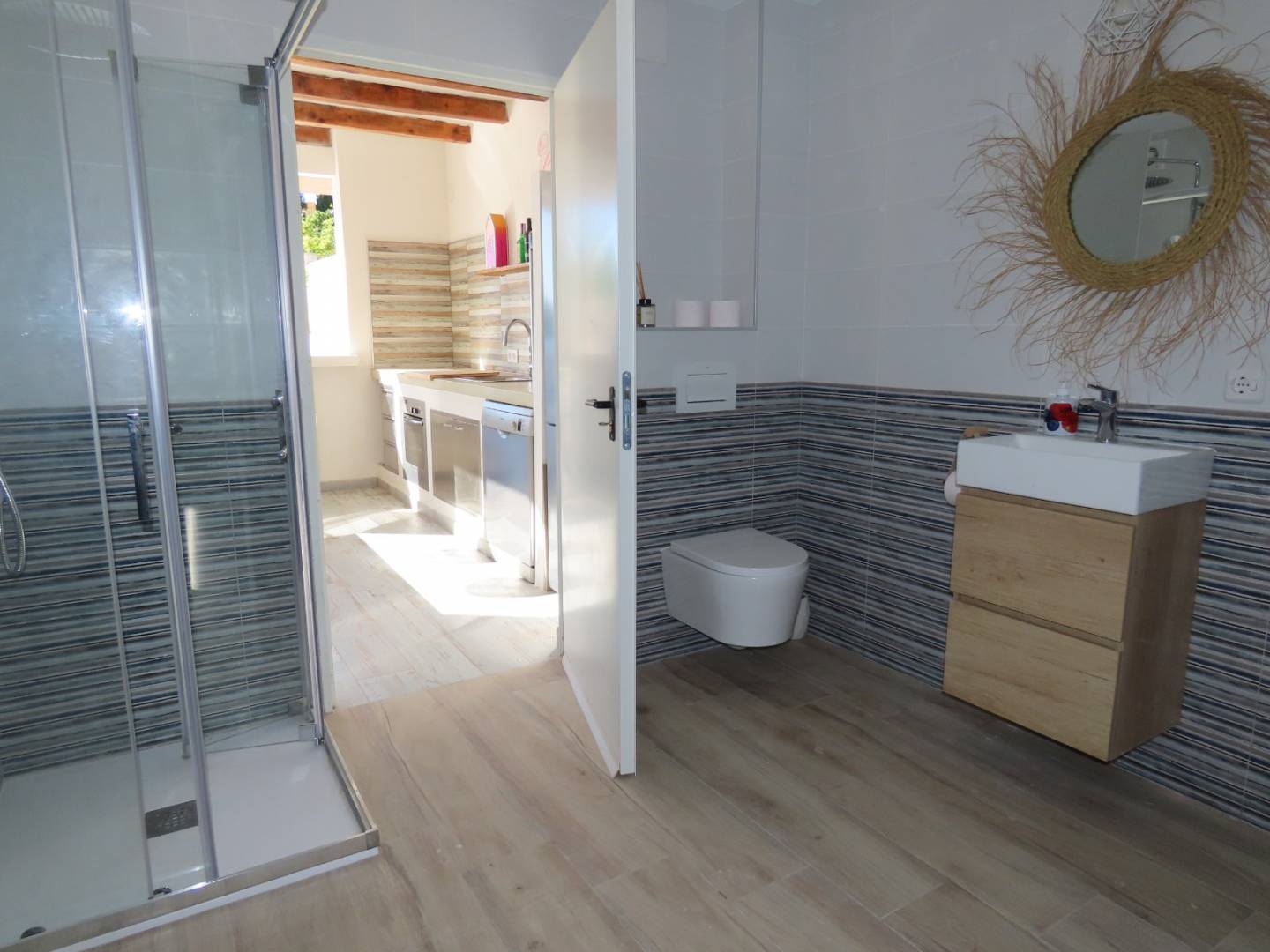 The interior is organized around a spacious entrance hall that leads to an open and bright living area , where a fully equipped modern kitchen is integrated, with white furniture and natural wood, creating a sophisticated and welcoming atmosphere.