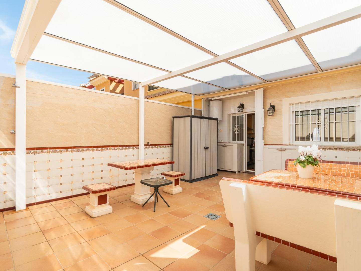 We present this fantastic 3-bedroom townhouse in the exclusive area of Villamartín, an ideal location to enjoy the sun and tranquility of the Costa Blanca. With 104 m2 of living space and a 130 m2 plot, this property offers everything you need to live comfortably and close to everything that matters to you.~~On the ground floor, the house features a spacious and bright living-dining room, a fully equipped independent kitchen with access to the west-facing rear terrace, a bedroom, and a full bathroom with a shower.~~Upstairs, you'll find the first floor, which includes two additional bedrooms, each with its own private terrace, and another full bathroom with a bathtub.~~On the second and top floor, there's a 15 m2 solarium where you can soak up the sun all day long.~~Enjoy your own oasis of tranquility with a spacious 30 m2 terrace, perfect for relaxing or entertaining, and a solarium to make the most of the views and the wonderful weather. Furthermore, its east-facing orientation guarantees excellent natural light throughout the day.~~Among the features that make this property stand out are air conditioning, built-in wardrobes, a practical laundry room, and an enclosed terrace on the first floor that expands the living space, providing greater comfort. It also boasts a large and attractive communal swimming pool, ideal for enjoying warm days and making the most of leisure time.~~The location is excellent, just 3.7 km from the beautiful beaches of La Zenia and Playa Flamenca, and surrounded by all essential amenities: La Zenia Boulevard shopping center is a 3-minute drive away, and there are supermarkets, schools, hospitals, parks, and playgrounds nearby. You'll also enjoy the proximity to the Villamartín golf course and easy access to public transportation.~~This house is being sold fully furnished and includes parking on the property.~~It's the perfect option for those looking for a functional, well-located home with everything you need to move in right away.~~Don't miss this opportunity! Contact us for more information and to arrange your visit.~~Price: €219,000. Taxes and closing costs not included (according to applicable regulations). A breakdown of additional costs will be provided before booking.~~In the case of a transaction with two intermediaries, the buyer's professional fees will be 1.5% of the final purchase price, with a minimum of €3,000, plus VAT (21%), unless expressly agreed otherwise. These fees are not included in the advertised price.