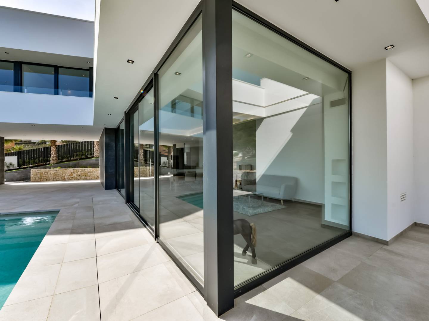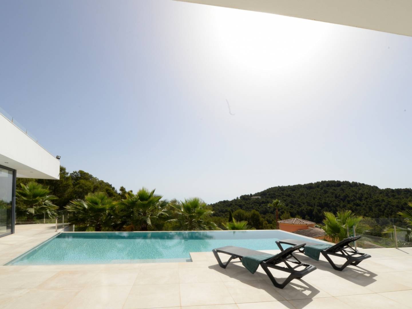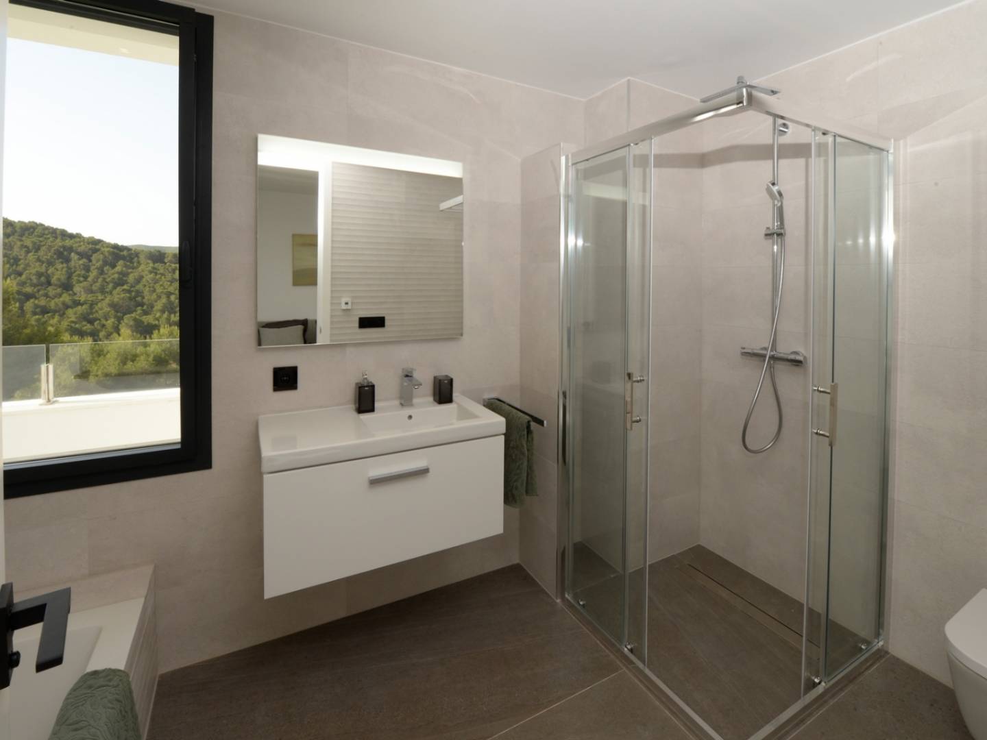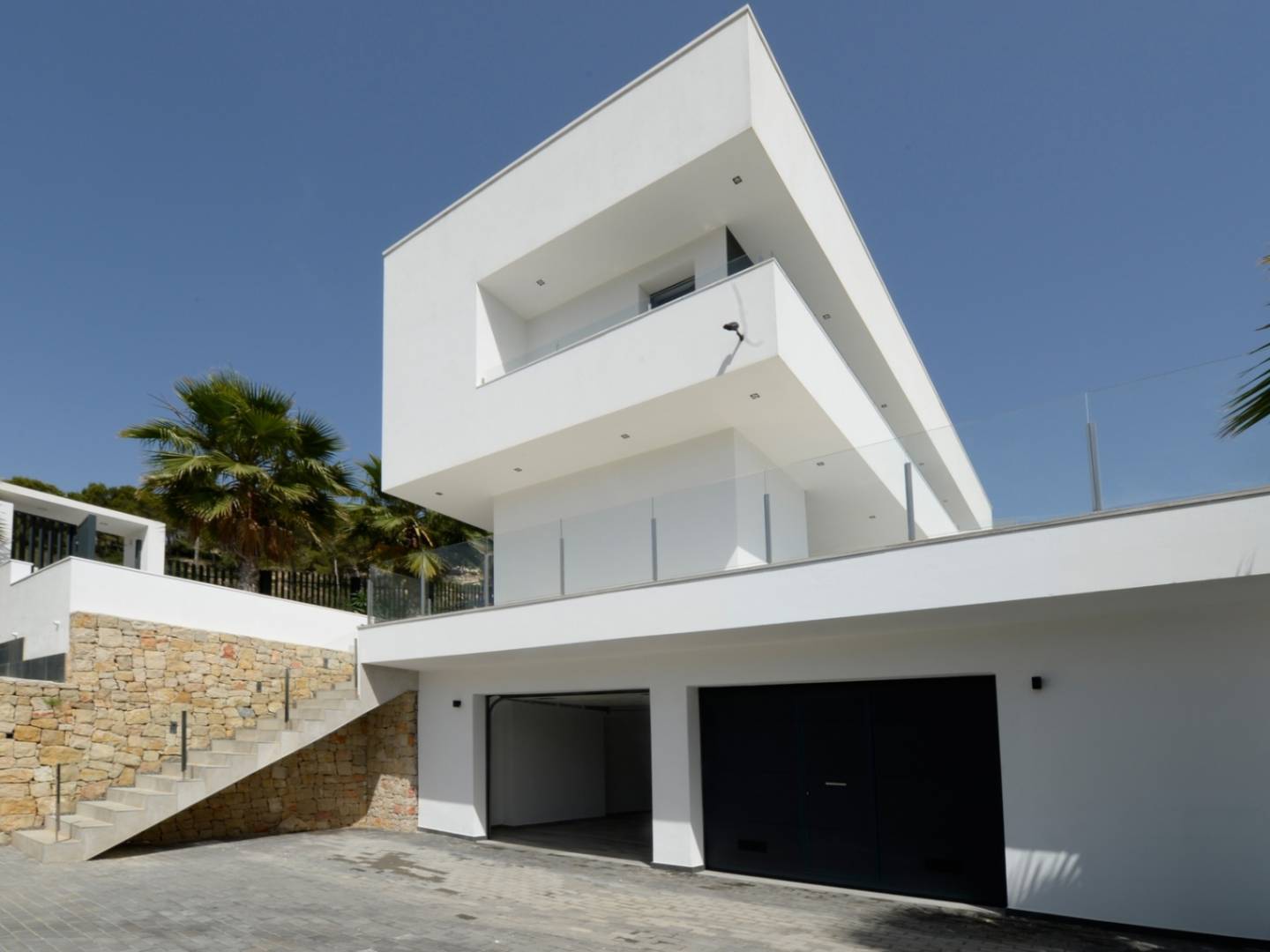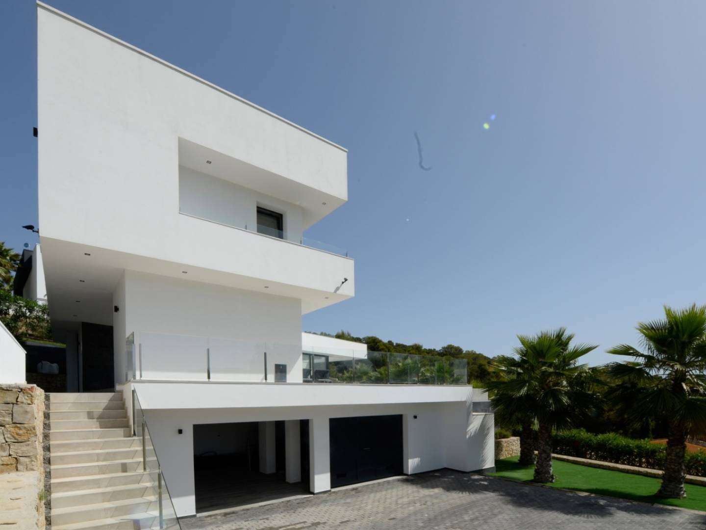 This impressive modern villa is located in a privileged position in Jávea, designed to perfectly integrate into the Mediterranean landscape with cutting-edge architecture that stands out for its pure shapes and straight lines. The property offers a spectacular panoramic view over the green hills reaching the blue of the sea, even allowing for a glimpse of the island of Ibiza on the clearest days. Its design achieves an exciting combination of classic elements with state-of-the-art materials, creating an atmosphere of luxury and exclusivity. The main floor consists of a spacious and bright living-dining room connected to a fully furnished and equipped high-end kitchen with a ceramic hob, oven, microwave, and dishwasher. This area is completed with a practical adjoining laundry room and a guest toilet. The interior space flows naturally to an extensive covered terrace with a barbecue area, perfect for enjoying the shade and sea views during the summer months. The outdoor area is crowned with a spectacular infinity pool equipped with underwater lights and a spacious entry area. On the upper floor is the resting area, which houses three bedrooms and two full bathrooms. The master bedroom has an en-suite bathroom, and all rooms have direct access to the rooftop terrace to maximize natural light entry. The lower level of the house offers a double garage with an automatic door and a spacious multifunctional basement. As for technical facilities, the villa has a centralized air conditioning system and heating via a heat pump supported by solar energy, ensuring maximum comfort and energy efficiency in all areas of the building.