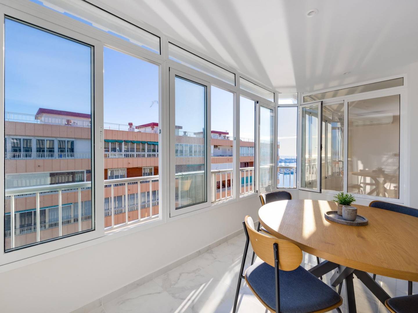 Discover this wonderful renovated beachfront penthouse in Torrevieja, a unique property that combines sea and Torrevieja lagoon views in a privileged setting. The 110 m² apartment features three bright bedrooms and three modern bathrooms , offering ample space and comfort for the whole family. Highlights include its impressive 40 m² living-dining room , ideal for gatherings and special occasions, and a separate, fully equipped kitchen with a utility room , perfect for everyday living. The building is well-maintained and offers a communal swimming pool and direct beach access , a highly valued feature in properties in this area. Located near the center of Torrevieja , this property represents an excellent opportunity as a primary residence , a second home , or a real estate investment on the Costa Blanca . An elegant, spacious property with a prime beachfront location.