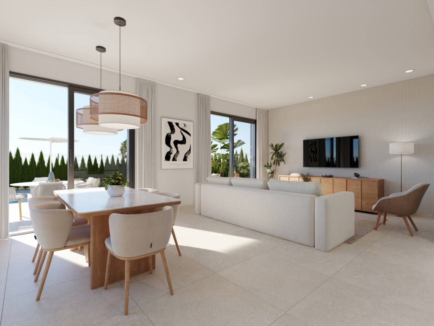 The exteriors of these detached homes are designed to make the most of the Mediterranean climate. Each property boasts a private garden, ideal for relaxation or outdoor activities. They also feature a terrace and a solarium, perfect for enjoying the views and the sunshine. The presence of a private swimming pool at each home adds a touch of luxury and exclusivity, allowing residents to cool off and enjoy the surroundings in complete privacy.