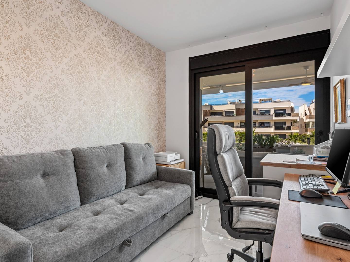 Discover this modern designer apartment in Orihuela Costa , located in a prestigious complex in the sought-after Los Altos area. Completed in 2024 , this property represents an excellent opportunity as a real estate investment , permanent residence , or holiday home . The apartment offers an elegant and bright open-plan living-dining room with an integrated kitchen , designed to maximize natural light thanks to its large windows with direct access to a spectacular private terrace of over 25 m² facing southwest, ideal for enjoying the sun all day long and pleasant views of the tropical gardens and communal pool . The apartment has two double bedrooms with built-in wardrobes , two modern bathrooms with premium finishes , and a constructed area of 65 m² , offering a functional and balanced layout. It is sold fully furnished and equipped with air conditioning , an Airzone smart home system, underfloor heating in the bathrooms , and electric blinds , guaranteeing maximum comfort all year round. Located on the first floor with elevator access , it also includes an underground parking space and a private storage room . This residential complex offers an authentic resort-style experience with a communal swimming pool , children's pool , gym , jacuzzi , and sauna , all surrounded by green spaces and with accessible access. Its excellent location allows for easy walking access to restaurants, supermarkets, and other amenities , and is just a short drive from the popular La Zenia Boulevard , as well as prestigious golf courses such as Villamartín Golf , Campoamor Golf , Las Ramblas , and Las Colinas Golf & Country Club . The best beaches of Orihuela Costa are less than 10 minutes away, and there are excellent connections to Alicante and Murcia airports. This property combines contemporary design, a prime location, and high profitability .