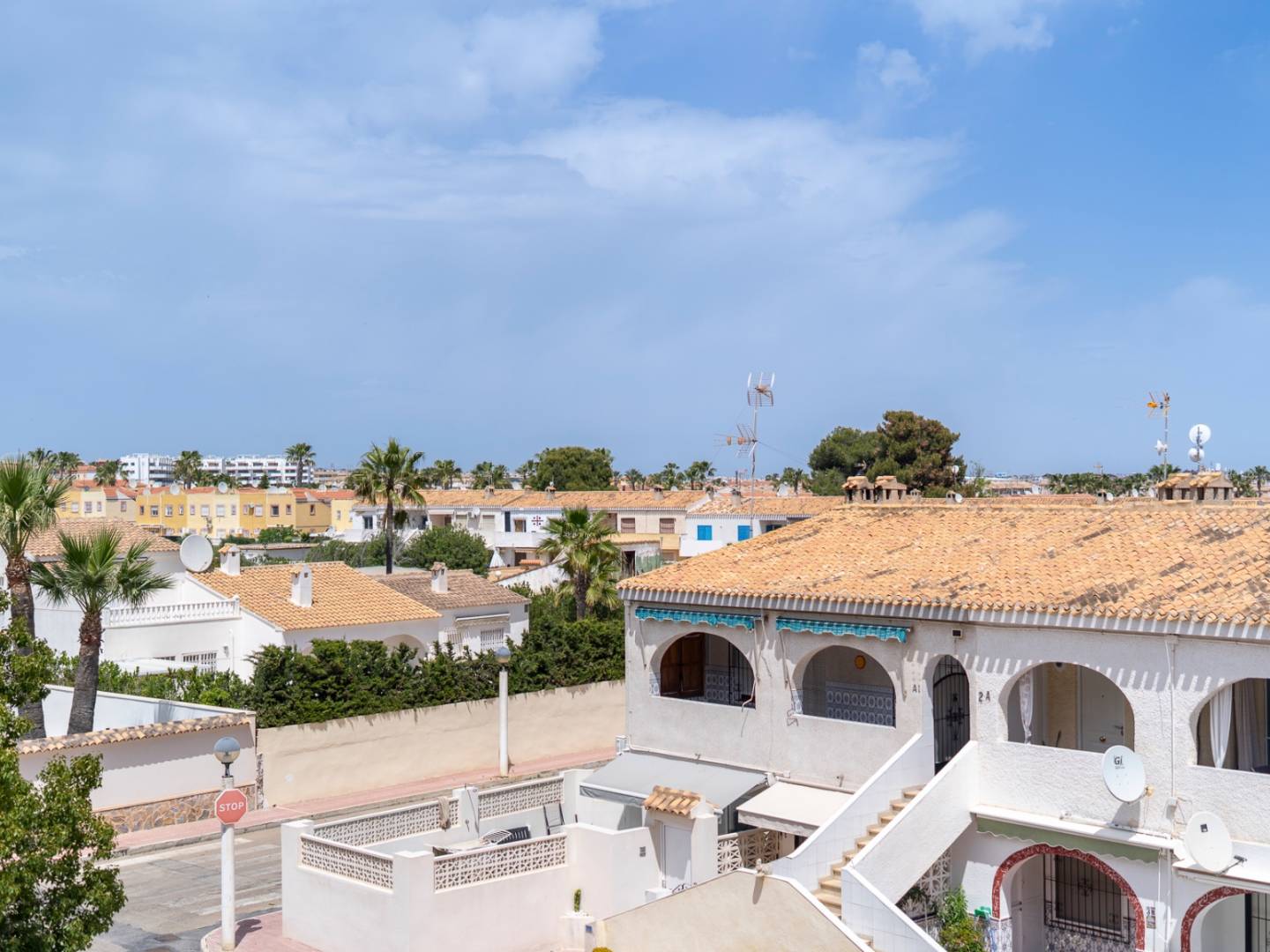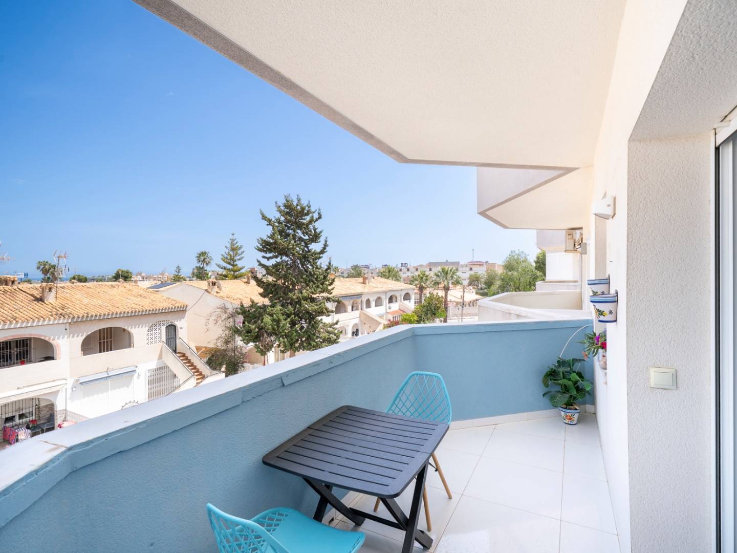 39 m² apartment located on the second floor with northeast orientation, comprising a living-dining room with open fully equipped kitchen, one bedroom with built-in wardrobe, and a complete bathroom with shower and space for a washing machine. The living room has direct access to a private terrace with open views over the urbanisation, surrounded by greenery and palm trees. The property features air conditioning and includes a private garage space, which is accessed from outside the building rather than directly from the interior lift or staircase. The building, constructed in 1973, has a lift and is surrounded by extensive green areas with trees. The location offers tranquillity within a well-established residential setting, with all services nearby and easy access to the beach.