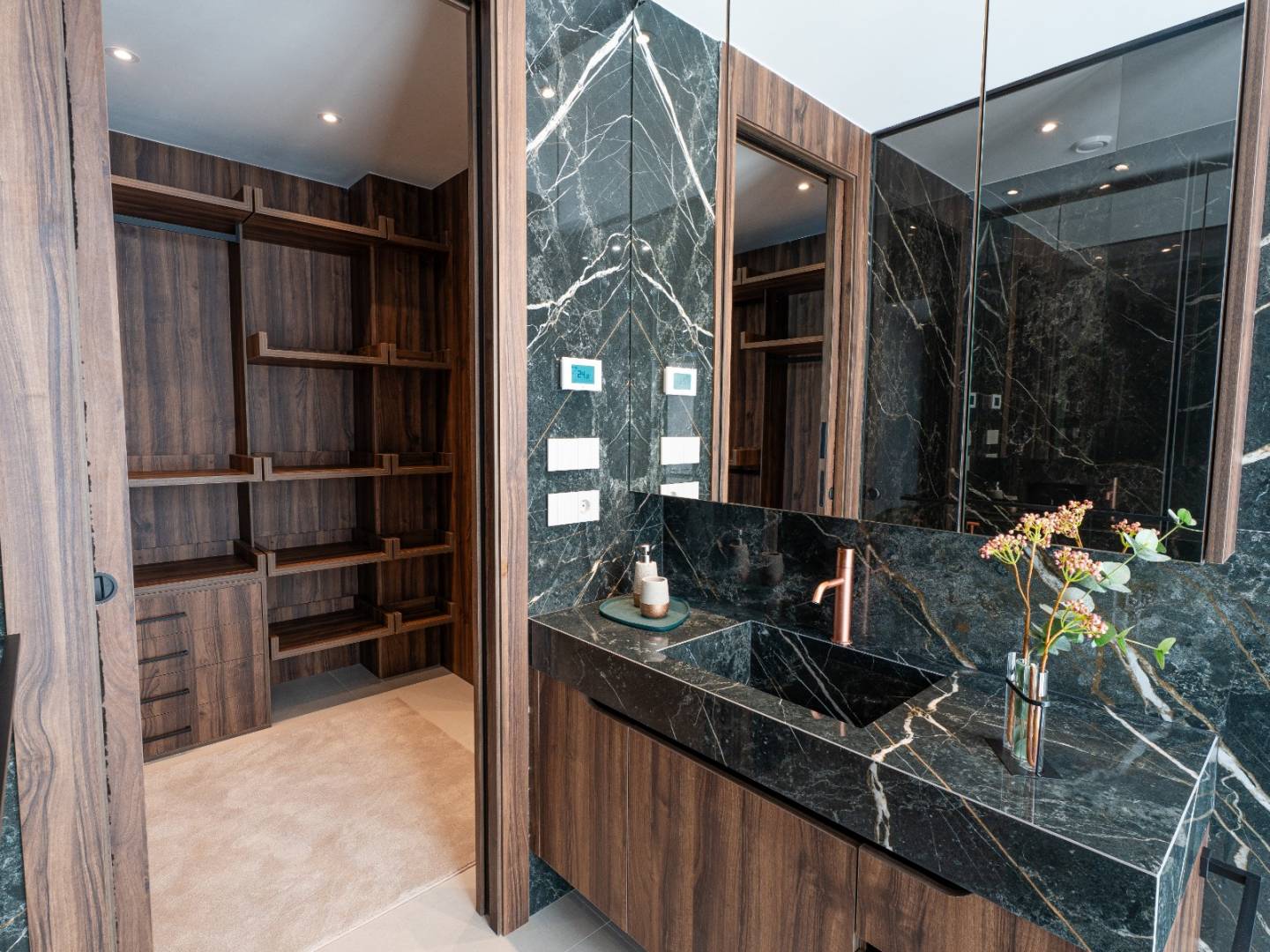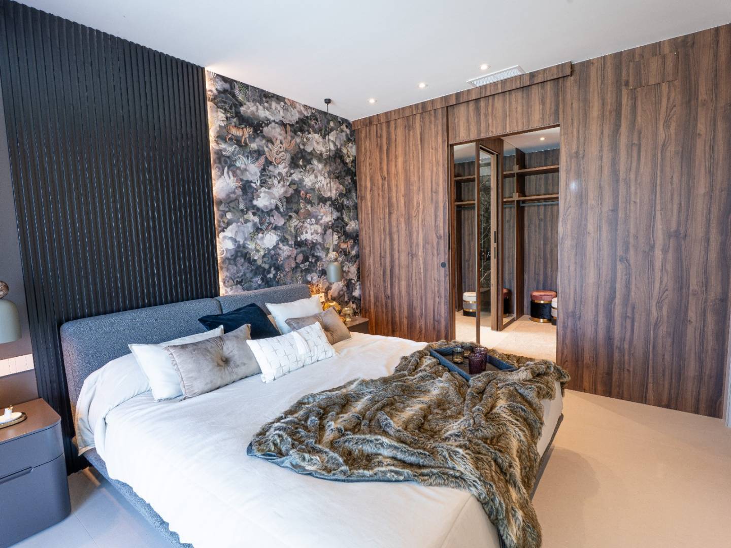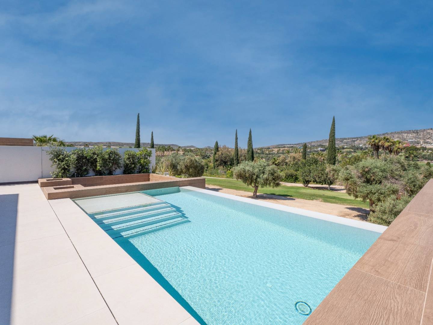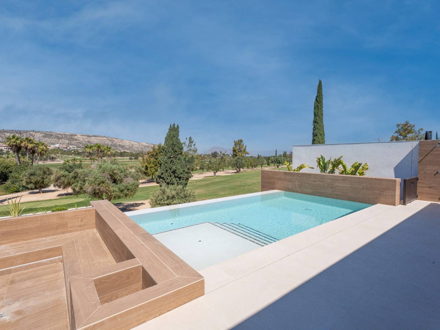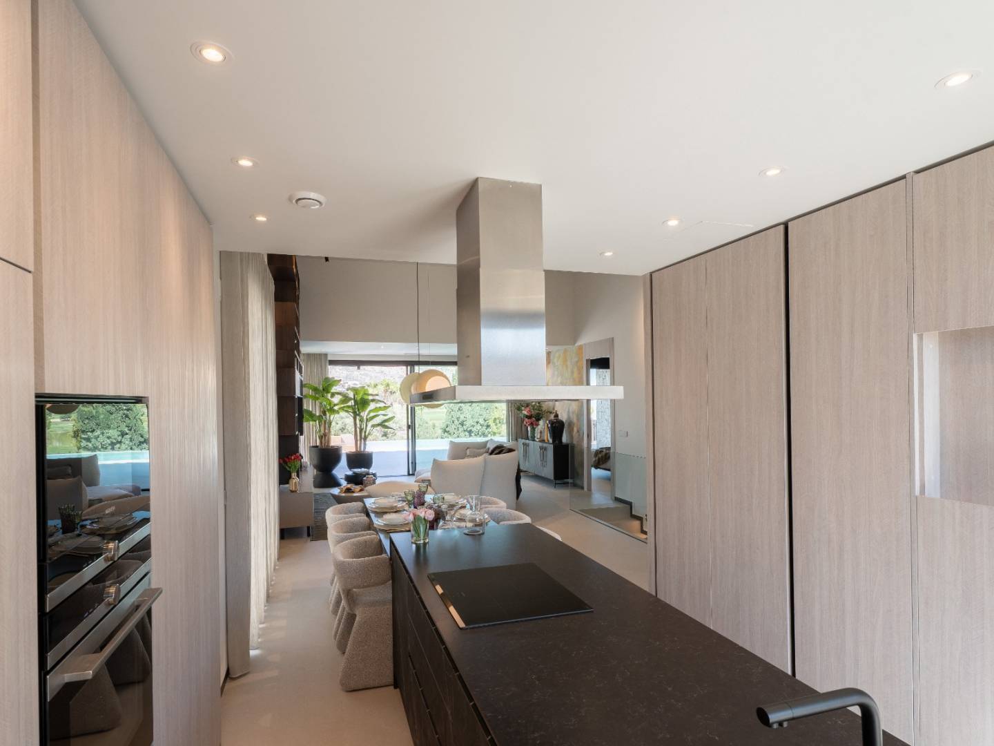 Cette villa neuve est aménagée sur deux niveaux : un sous-sol et un rez-de-chaussée. Elle offre toutes les commodités, notamment une piscine privée à débordement, un parking souterrain, un jardin et une vue sur le golf .