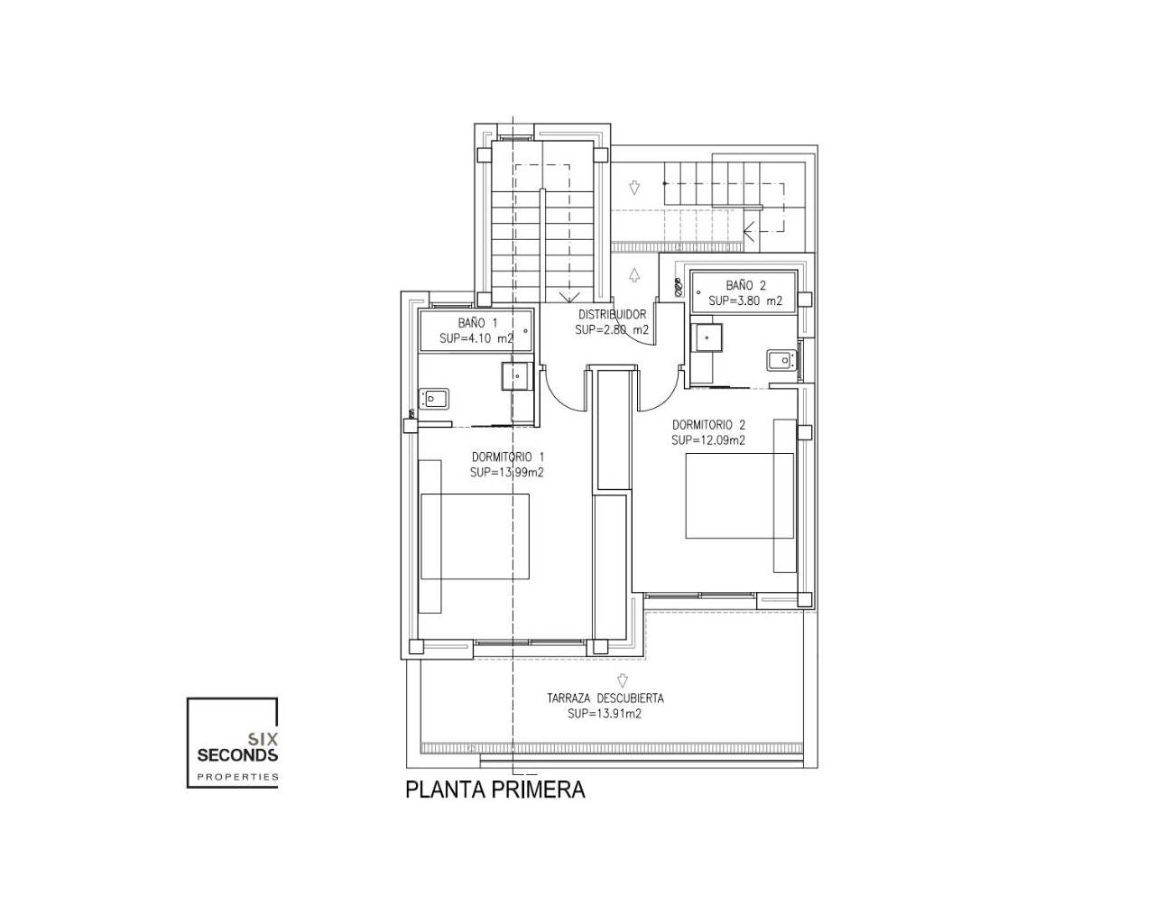Au premier étage, il y a deux chambres avec salle de bain et terrasse. Dans le couloir se trouve l'accès au solarium qui est le toit plat de la maison.
