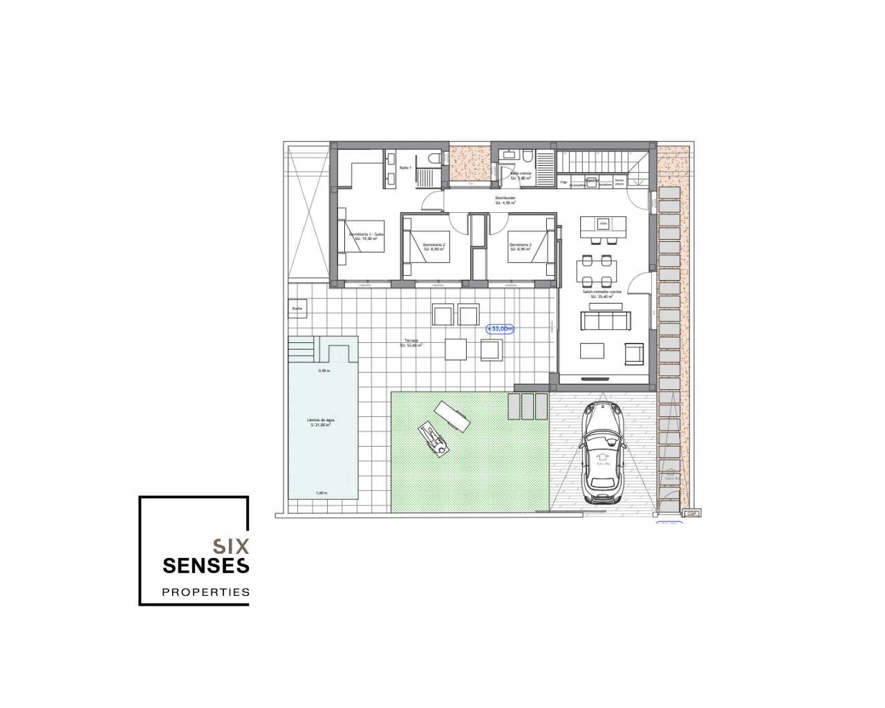 Il s'agit d'une propriété de style moderne qui se compose d'un spacieux salon-salle à manger avec cuisine ouverte équipée, de 3 chambres, dont une avec dressing, et de 2 salles de bains (dont une en suite). Chaque parcelle privée est distribuée en une terrasse, une aire de stationnement, une piscine privée et un jardin de style méditerranéen. De plus, chaque villa dispose d'un solarium avec des vues magnifiques vers la côte de Guardamar et le terrain de golf, ce qui fait de cette résidence un attrait pour les clients qui apprécient la situation géographique de leurs maisons.