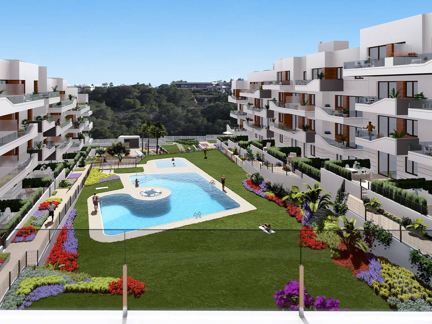 Le développement (périmétriquement fermé), compte un total de 94 appartements distribués en 3 blocs de rez-de-chaussée plus trois hauteurs, de 2 et 3 chambres à coucher avec 1 ou 2 salles de bain, et tous disposeront d'une place de parking au sous-sol avec ou sans débarras. Le lotissement dispose d'environ 3 300 mètres carrés d'espaces communs avec WiFi commun, 2 piscines (adultes et enfants), 1 jacuzzi et 2 aires de jeux pour la pétanque. Vous décidez où vous voulez vivre : appartements au rez-de-chaussée avec jardin privé, appartements au premier ou au deuxième étage avec de grandes terrasses conçues pour profiter de la lumière et des vues des espaces communs ou les magnifiques penthouses du troisième étage avec solarium.