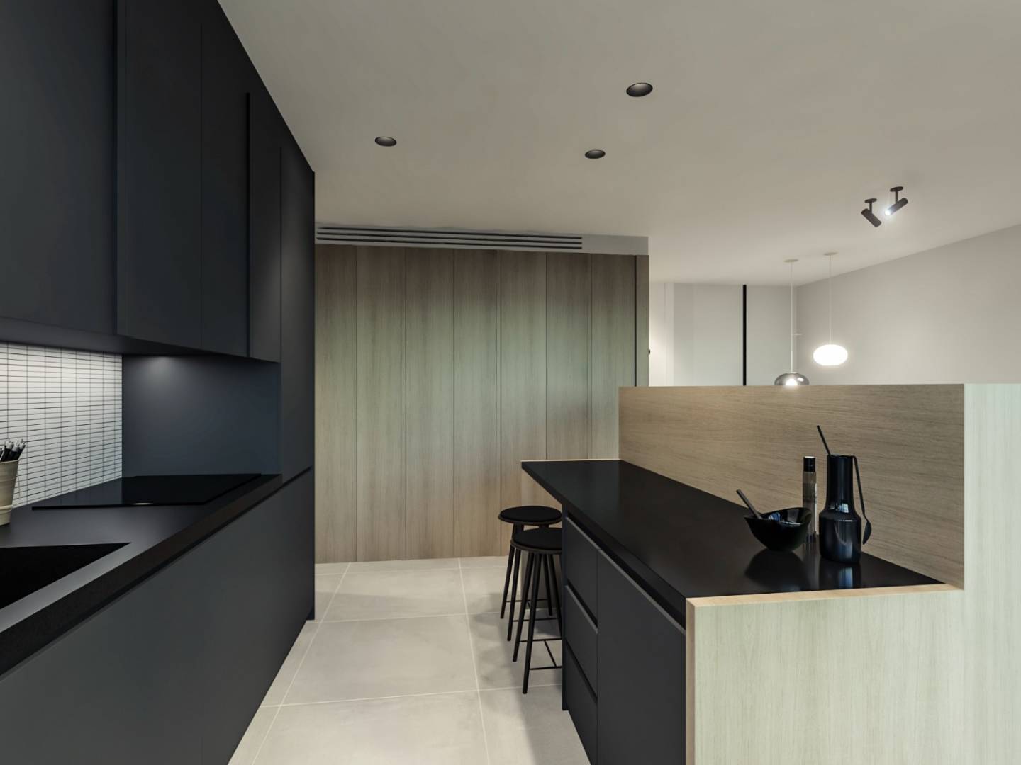 Les cuisines sont modernes et très fonctionnelles, avec des lignes droites et des matériaux durables. Elles sont équipées de plans de travail compacts en quartz et de robinets mélangeurs à basse pression pour réduire la consommation d'eau. De plus, les cuisines seront livrées entièrement équipées, avec notamment une hotte aspirante intégrée, un four électrique, un micro-ondes, une plaque à induction, un lave-linge, un lave-vaisselle et un réfrigérateur.