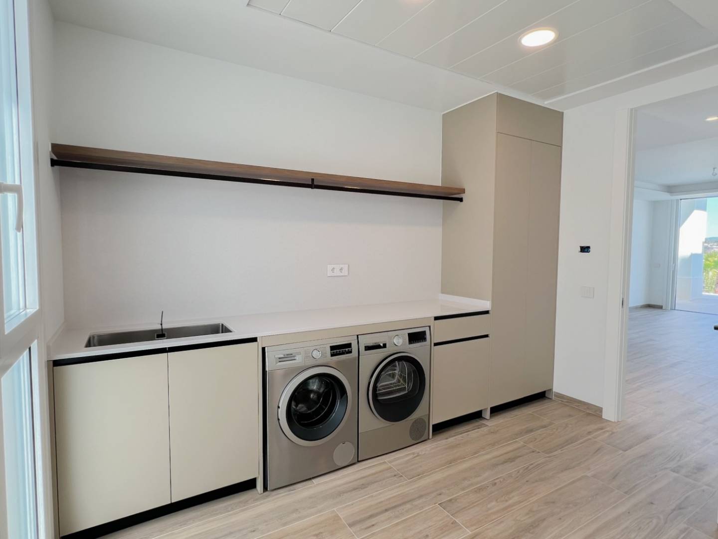 La propriété est distribuée sur deux étages. Le rez-de-chaussée est accessible depuis le niveau de la rue en montant un élégant escalier. La première chose que l'on trouve est un hall d'entrée ouvert sur le séjour indépendant . A côté se trouve la salle à manger qui offre une vue sur la piscine, puis on trouve la cuisine avec un îlot central qui a accès à la terrasse couverte. Nous avons une chambre avec une salle de bain en suite au rez-de-chaussée et des toilettes invités. Nous trouvons également une buanderie séparée.