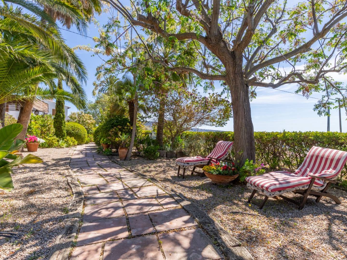 Entre les 2 bâtiments se trouve le jardin, avec toutes sortes de plantes matures et un espace détente à l'ombre des palmiers qui mène à la zone de baignade avec une grande terrasse avec des trottoirs antidérapants de plus de 200m2, qui entoure la piscine . .