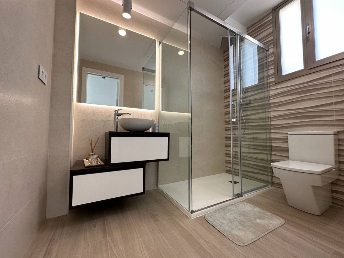 En entrant dans la villa, vous serez captivé par les espaces lumineux et ouverts qui se dévoilent devant vous. Le rez-de-chaussée vous offre une cuisine design contemporaine, entièrement équipée et ouverte sur l'élégant salon-salle à manger. Cet espace fluide et polyvalent est parfait pour profiter de moments inoubliables avec vos proches. Deux chambres superbement conçues avec deux salles de bains vous offrent une intimité et un confort absolu.