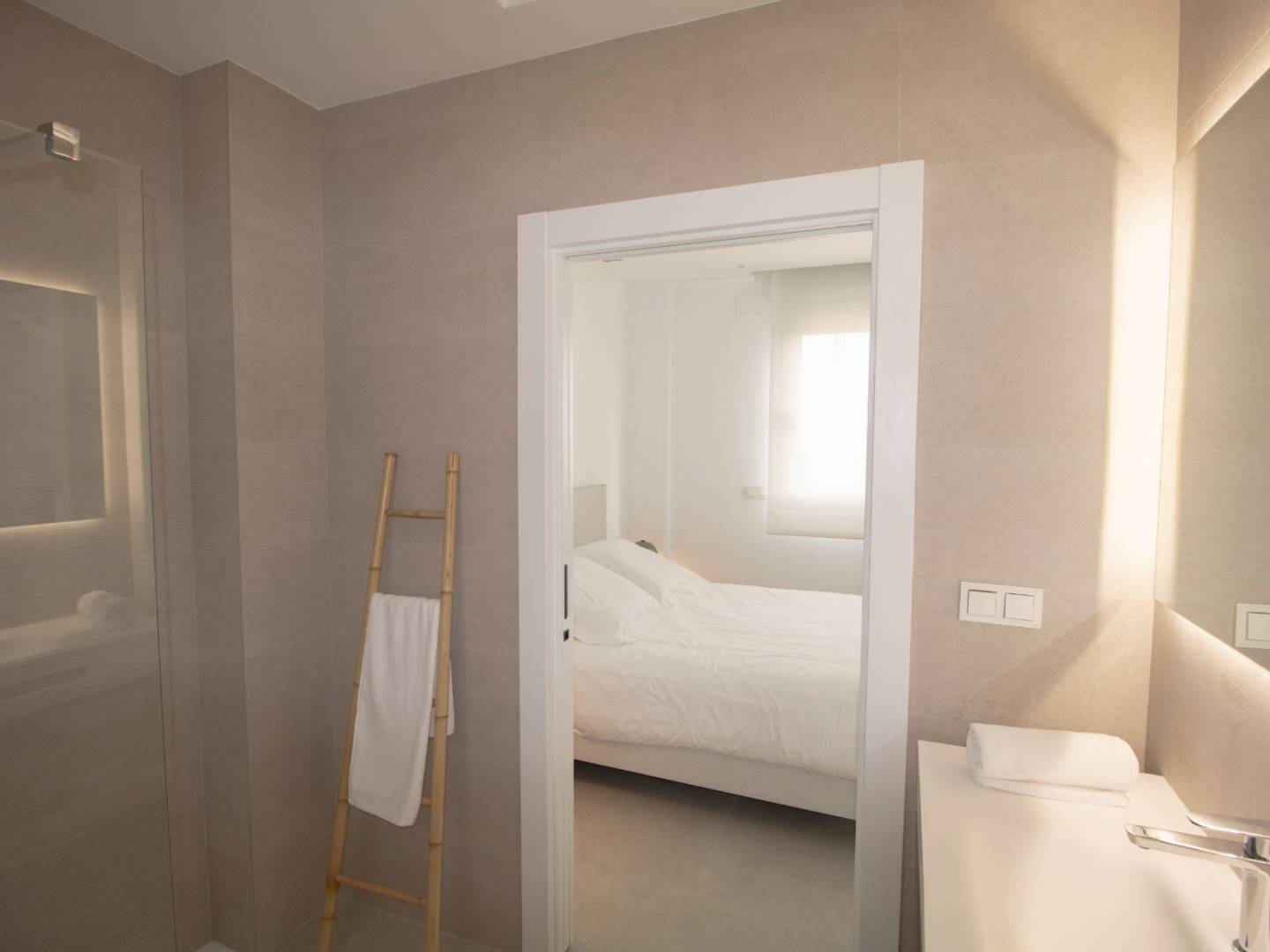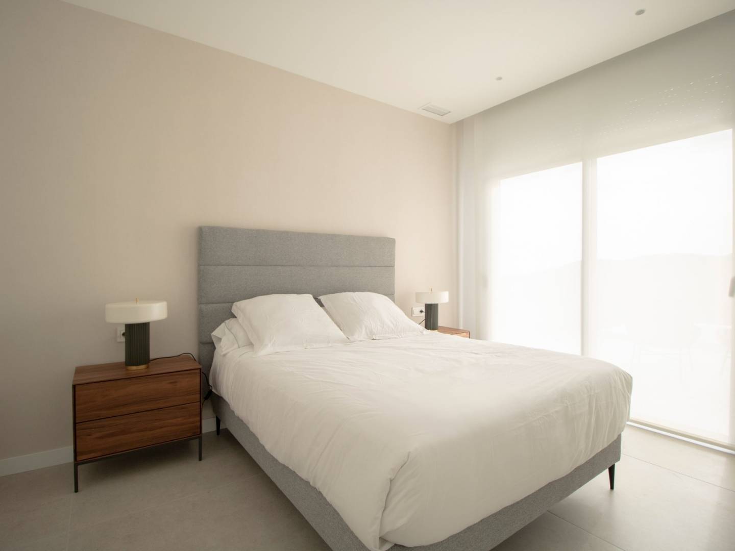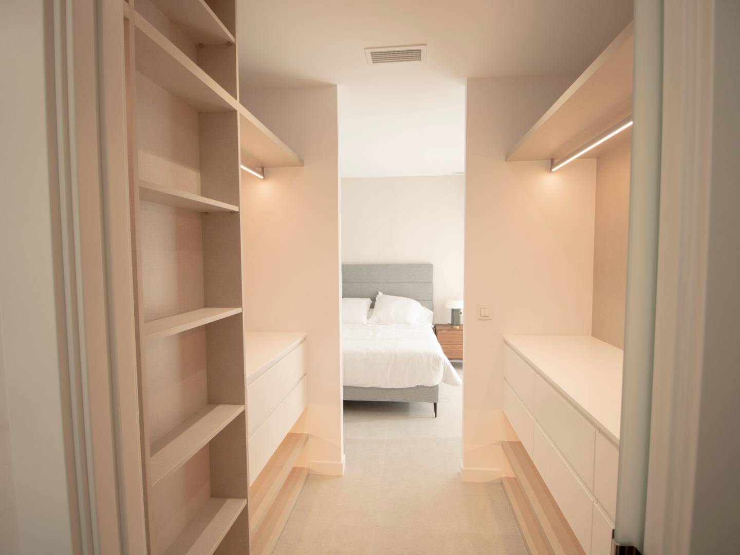 La chambre principale au dernier étage est une suite avec un dressing, une salle de bain privée et un accès direct au solarium, vous offrant un espace privé et exclusif pour vous détendre et profiter de la vue panoramique. Vous trouverez également une deuxième suite avec une armoire intégrée et une salle de bain privée à l'étage supérieur, ainsi qu'une chambre double avec une armoire intégrée au rez-de-chaussée.