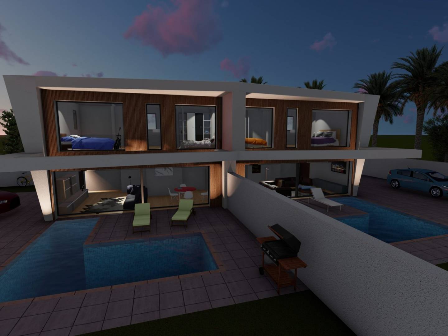 Villa jumelée à double hauteur pouvant accueillir jusqu'à 4 chambres , avec cuisine ouverte séparée ou salon. Elle dispose d'une grande terrasse et d'une véranda. Elle est également équipée d'un système d'énergie renouvelable avec chauffage aérothermique. La maison peut également être équipée d'une piscine privée moderne.