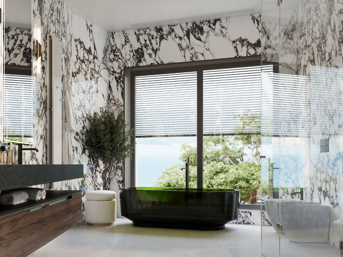 Avec un design sophistiqué alliant matériaux de haute performance et revêtements exclusifs , la villa dispose de grandes fenêtres et de hauts plafonds d'une hauteur libre de 2,80 m qui créent une sensation d' espace et de lumière .
