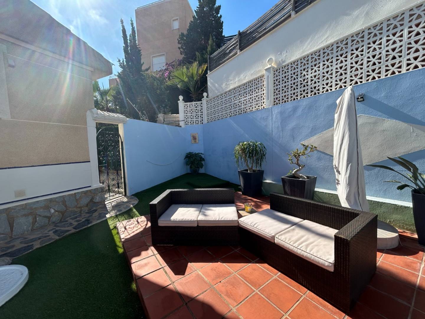 La villa dispose d'une piscine privée en forme de rein entourée de gazon artificiel, d'une douche extérieure et d'un espace barbecue au bord de la piscine, idéal pour profiter du climat méditerranéen. Les terrasses avant et arrière créent différents environnements extérieurs, tandis que la terrasse couverte avec protection solaire est parfaite pour se détendre à tout moment de la journée.