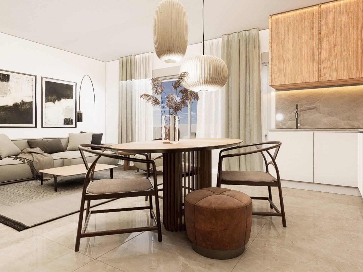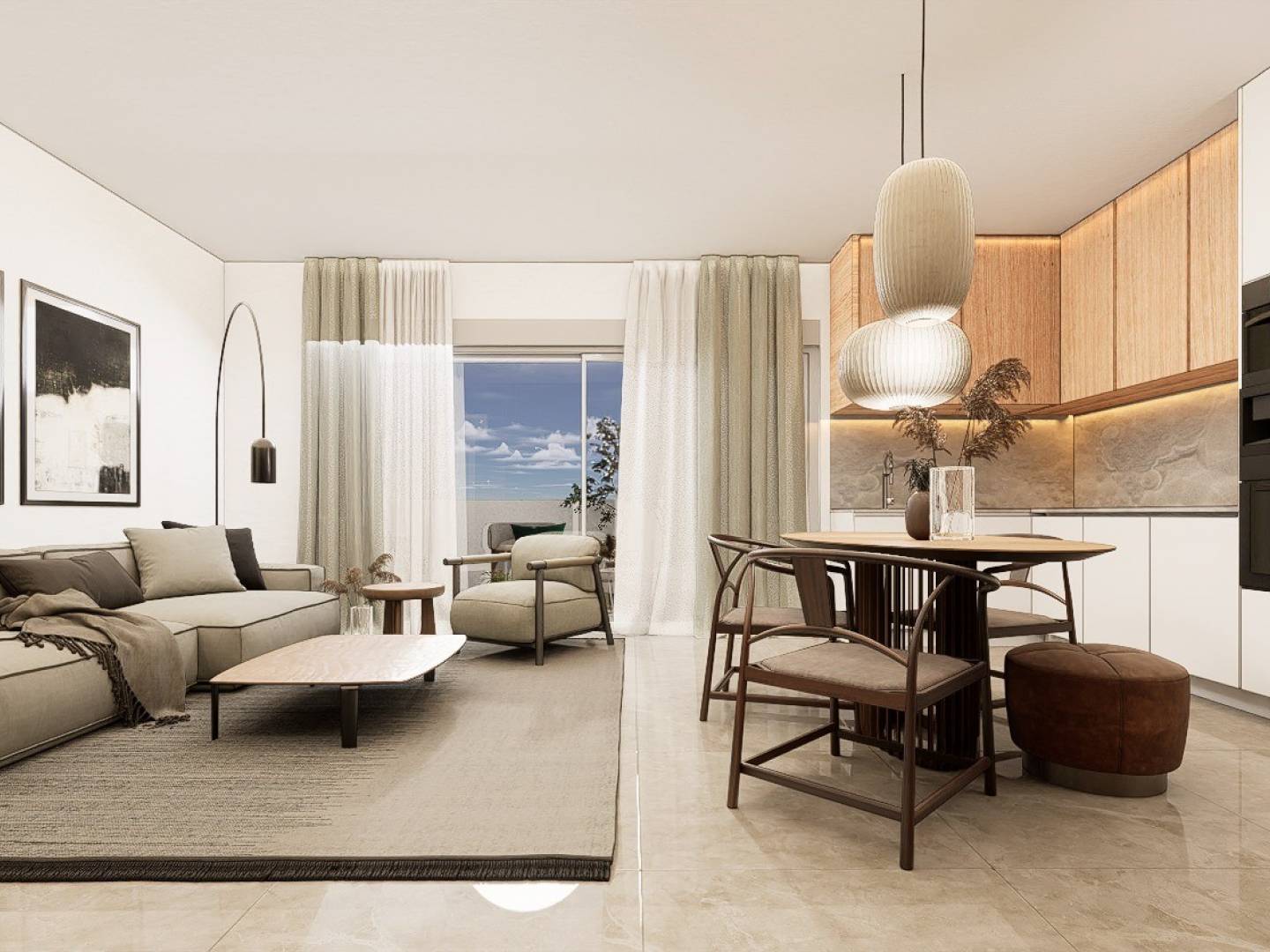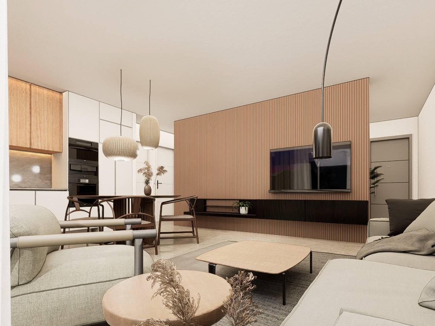 Chaque appartement dispose d'une cuisine moderne entièrement équipée avec four, micro-ondes, lave-vaisselle intégré, réfrigérateur, plaques vitrocéramiques et hotte aspirante. L'éclairage LED est présent à l'intérieur, dans les pièces comme le salon, la cuisine, les couloirs et les salles de bains, ainsi que dans les espaces extérieurs. Les chambres sont équipées de placards avec tiroirs, étagères et tringles à vêtements.