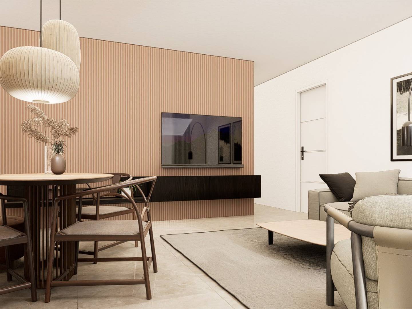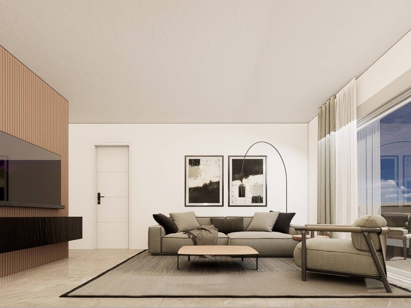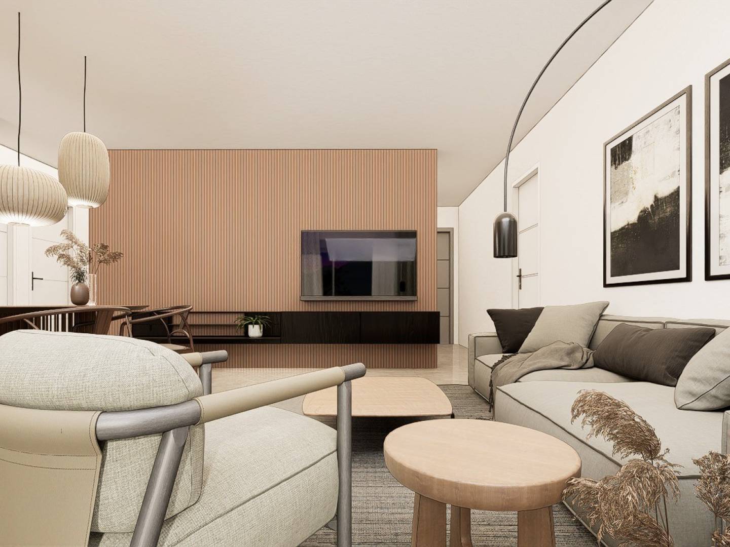 Chaque appartement dispose d'une cuisine moderne entièrement équipée avec four, micro-ondes, lave-vaisselle intégré, réfrigérateur, plaques vitrocéramiques et hotte aspirante. L'éclairage LED est présent à l'intérieur, dans les pièces comme le salon, la cuisine, les couloirs et les salles de bains, ainsi que dans les espaces extérieurs. Les chambres sont équipées de placards avec tiroirs, étagères et tringles à vêtements.