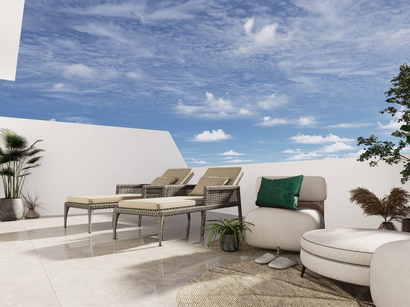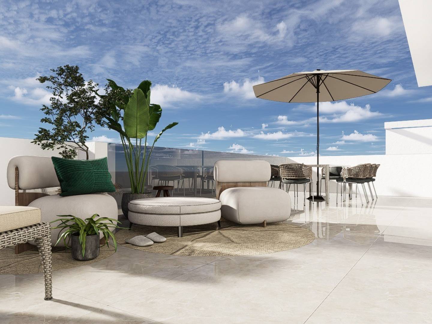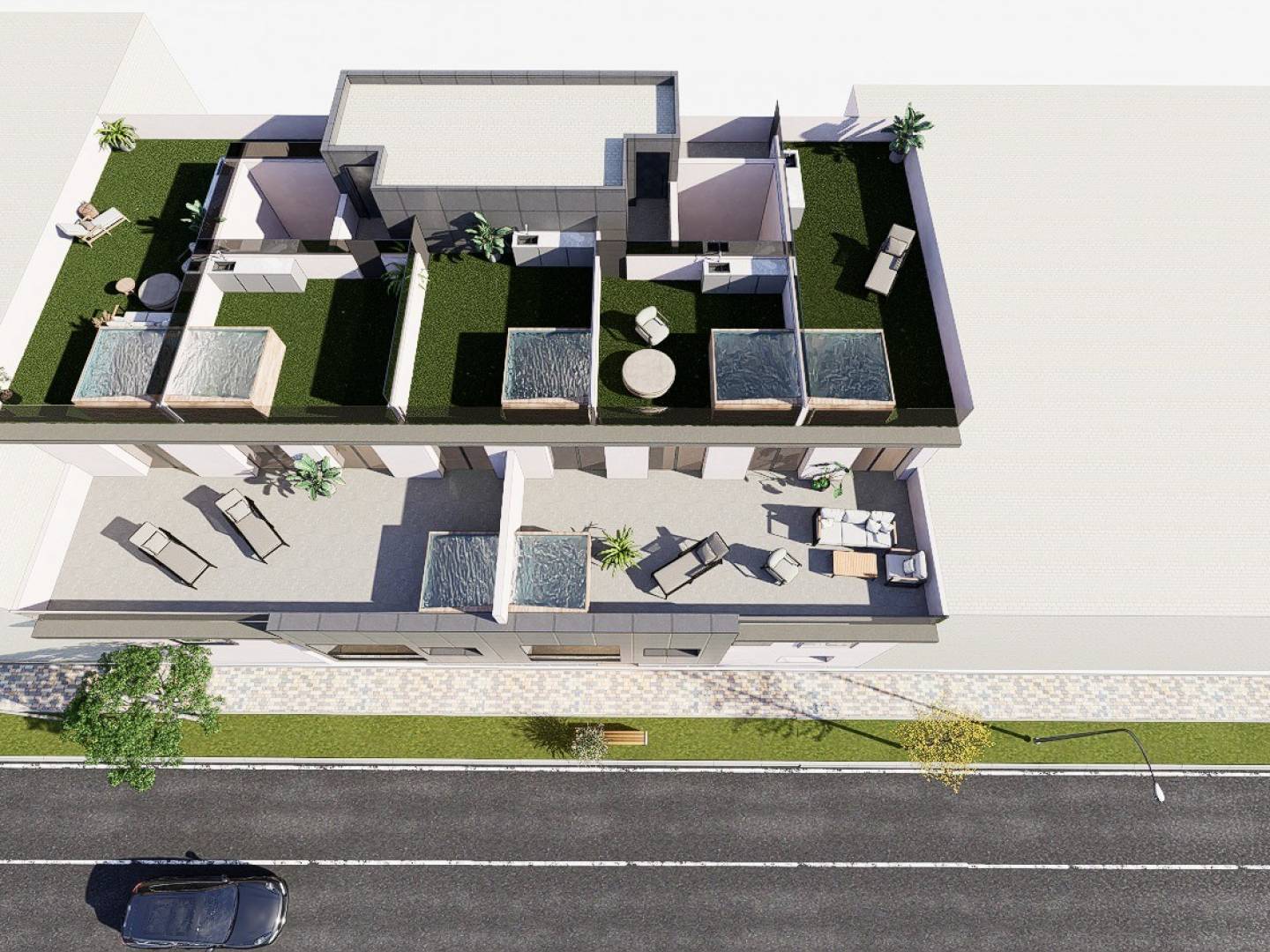 Pour profiter du plein air, chaque appartement du rez-de-chaussée et du premier étage dispose d'une terrasse privée ensoleillée avec cuisine d'été . En prime, chaque maison comprend un jacuzzi privé , ajoutant une touche de luxe et de détente.