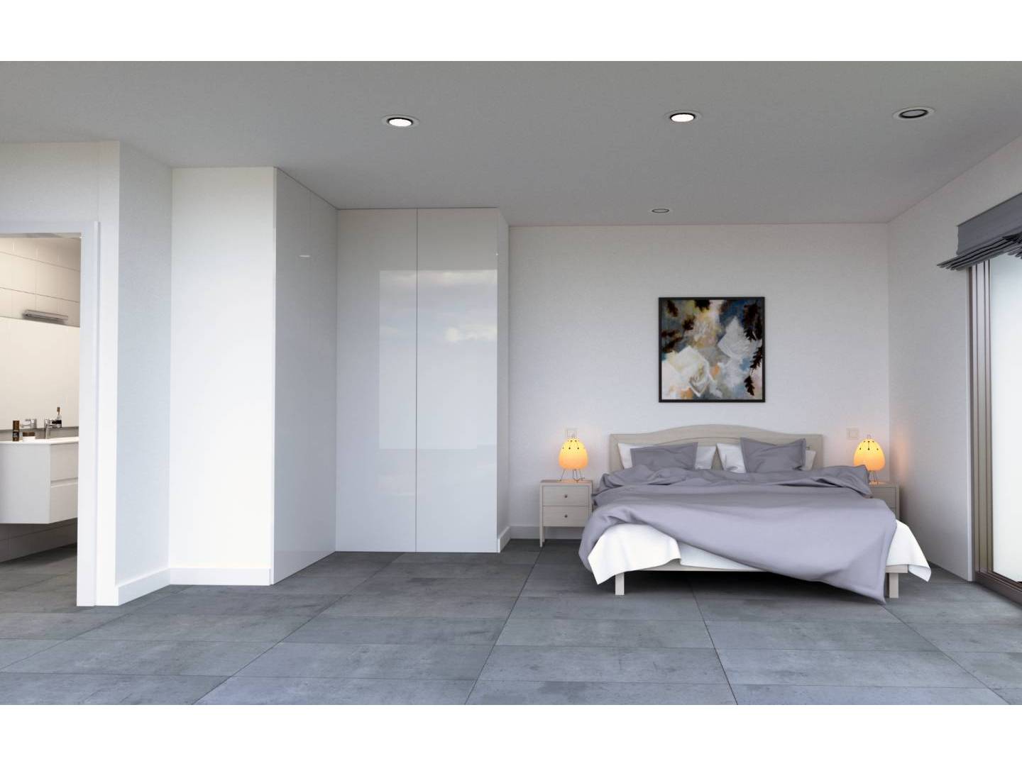 Le sol est en grès cérame 60x60 dans toute la maison, y compris sur les terrasses, avec différentes dimensions et options disponibles. Les salles de bains sont entièrement équipées de carrelage blanc, d'un meuble vasque, d'un miroir et d'un luminaire, et peuvent accueillir une douche.