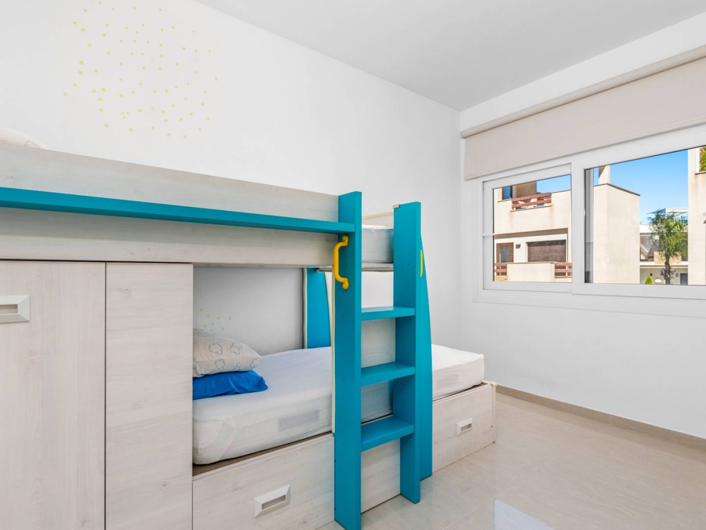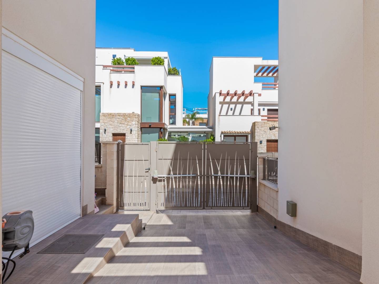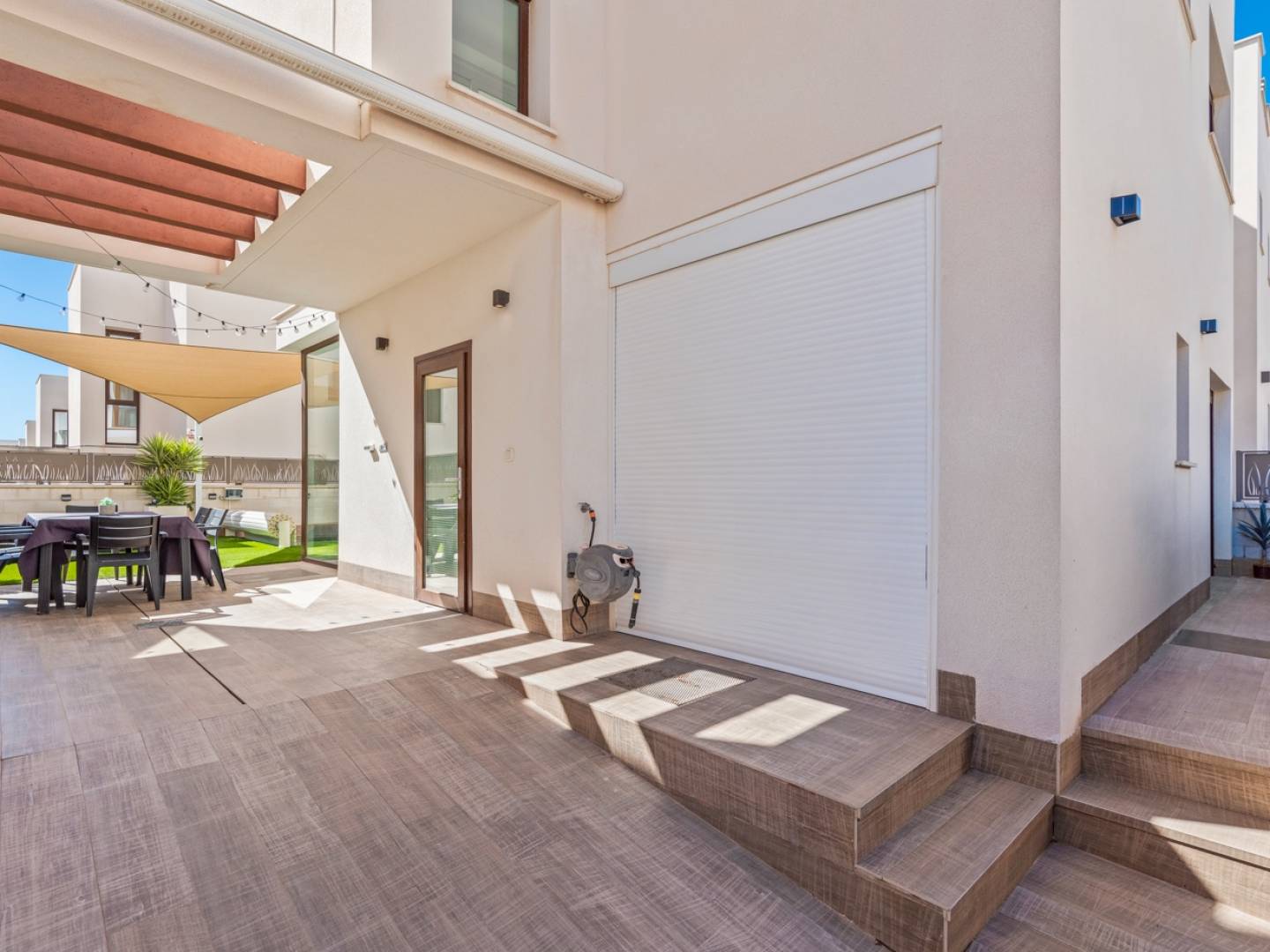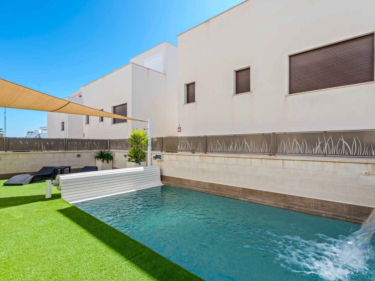 Située dans un complexe résidentiel de 50 maisons indépendantes, cette propriété offre un agencement fonctionnel et des espaces de vie confortables. Construite en 2018, elle dispose d'une surface totale de 101 m² sur un terrain de 182 m², comprenant trois chambres et trois salles de bains. Au rez-de-chaussée, on trouve un salon avec cuisine intégrée, une salle de bains complète, une chambre et une buanderie équipée d’un lave-linge et d’un sèche-linge de 8 kg. Le premier étage comprend deux chambres supplémentaires, dont une avec salle de bains privative et accès à une terrasse privée. Le dernier étage dispose d’un solarium avec espace prévu pour une cuisine extérieure et une installation de jacuzzi. L’extérieur comprend une piscine privée d’eau salée avec couverture automatique, un jardin en gazon artificiel et un espace de stationnement sur la parcelle. La maison est équipée d’un système de chauffage et de climatisation par aérothermie, de deux stores automatiques et d’une voile d’ombrage. Parmi les équipements supplémentaires, on trouve des appareils électroménagers de cuisine intégrés, une machine à café Wi-Fi Bosch entièrement automatique, des stores motorisés, des moustiquaires aux fenêtres et portes, des parois de douche en verre, un système de sécurité intérieur et extérieur, ainsi qu’un coffre-fort. La propriété est située dans un quartier calme avec un bon accès aux centres urbains à proximité. Pour plus d’informations ou pour organiser une visite, contactez-nous.