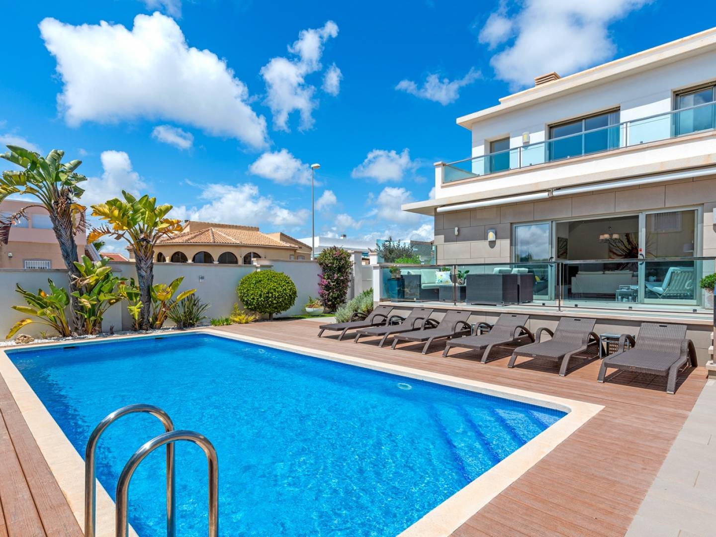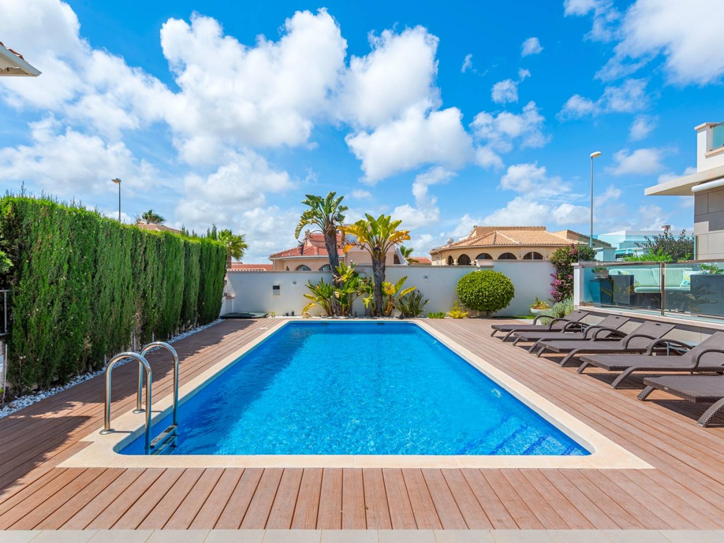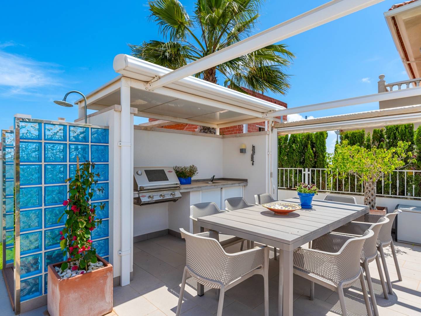 A l'extérieur, le terrain de 500 m² exposé plein sud offre une superbe piscine entourée de chaises longues, une cuisine extérieure avec barbecue et coin repas couvert, plusieurs terrasses avec espaces détente, un débarras et un parking privé avec portail automatique.
