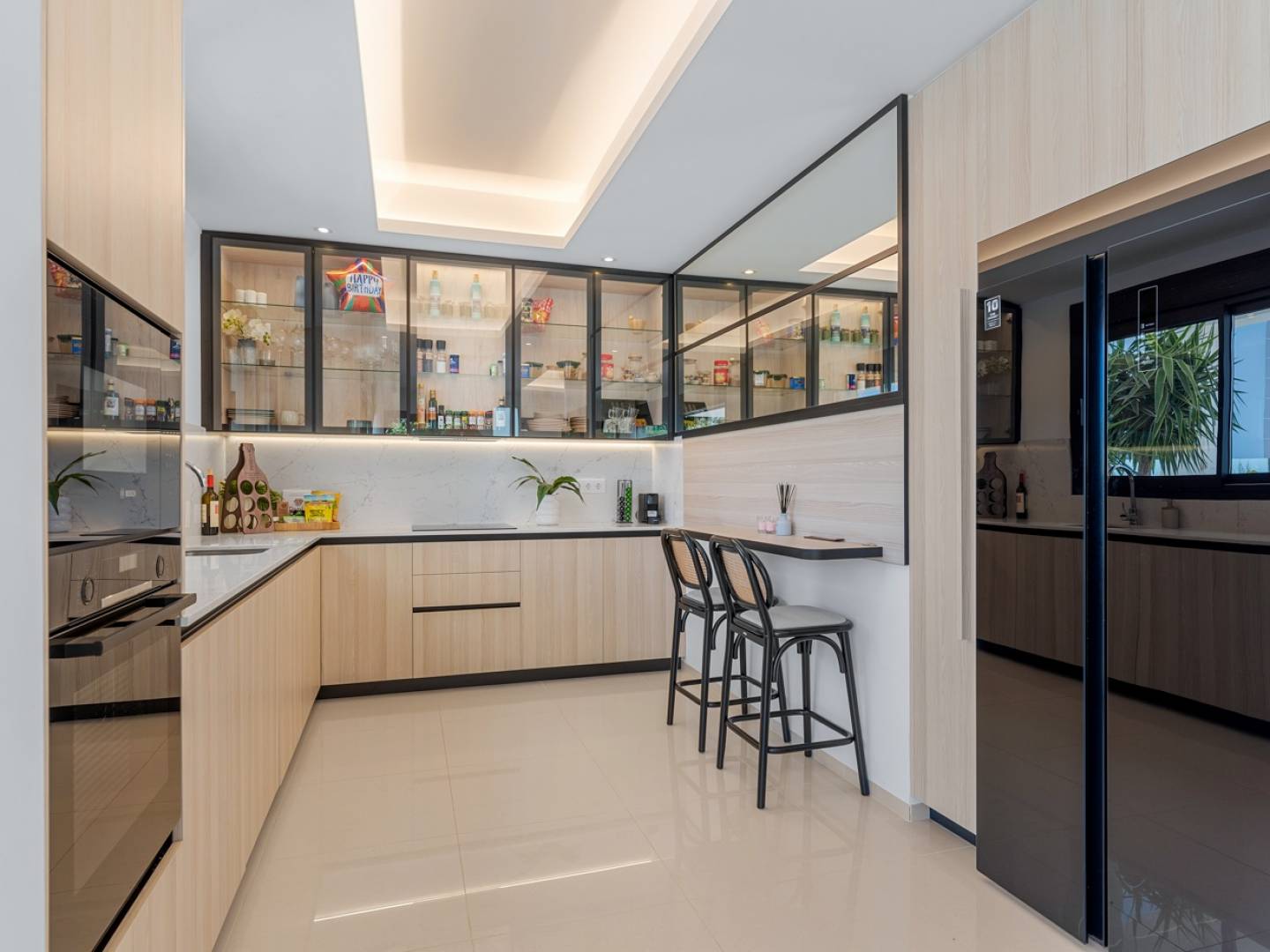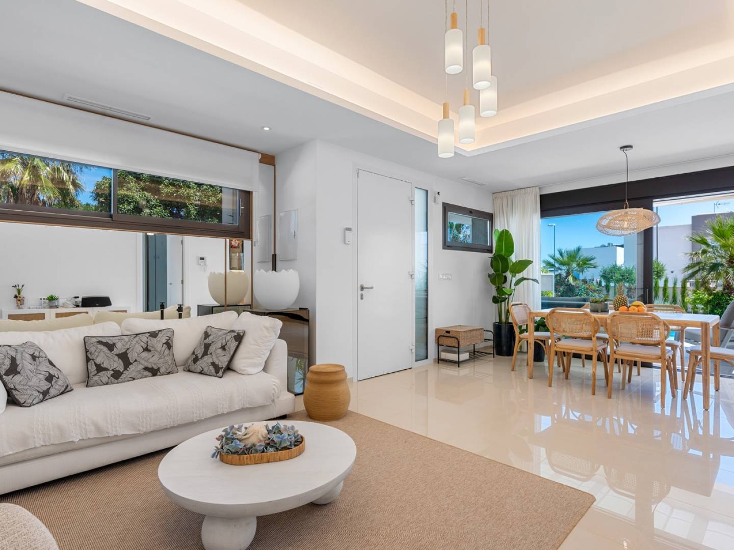 L'intérieur offre un agencement soigné, avec un spacieux salon-salle à manger baigné de lumière naturelle et une cuisine ouverte donnant directement sur la terrasse, idéale pour profiter du style de vie méditerranéen. La propriété comprend trois chambres et deux salles de bains, dont une attenante à la chambre principale, ainsi qu'une buanderie pratique avec accès à l'extérieur.