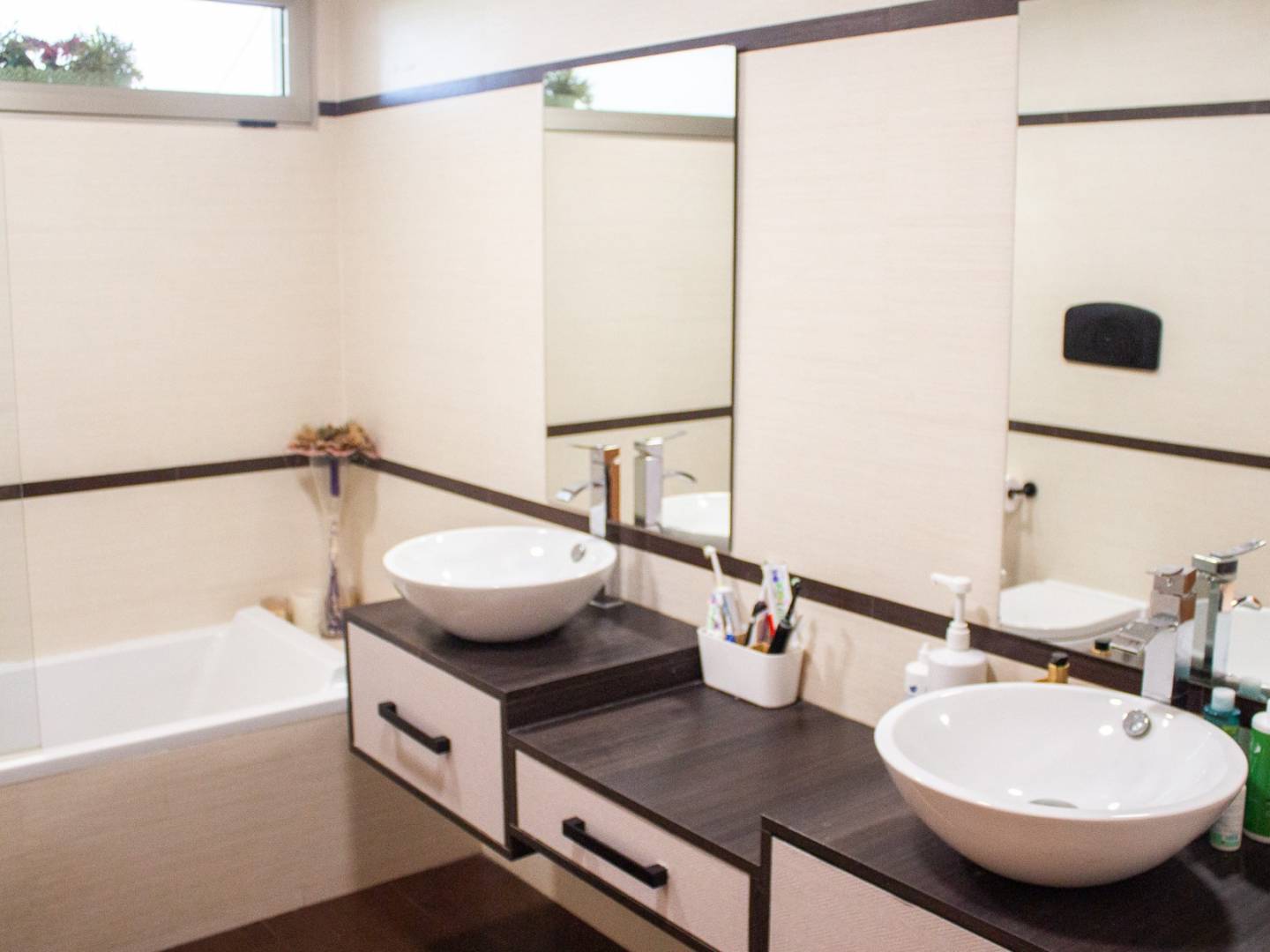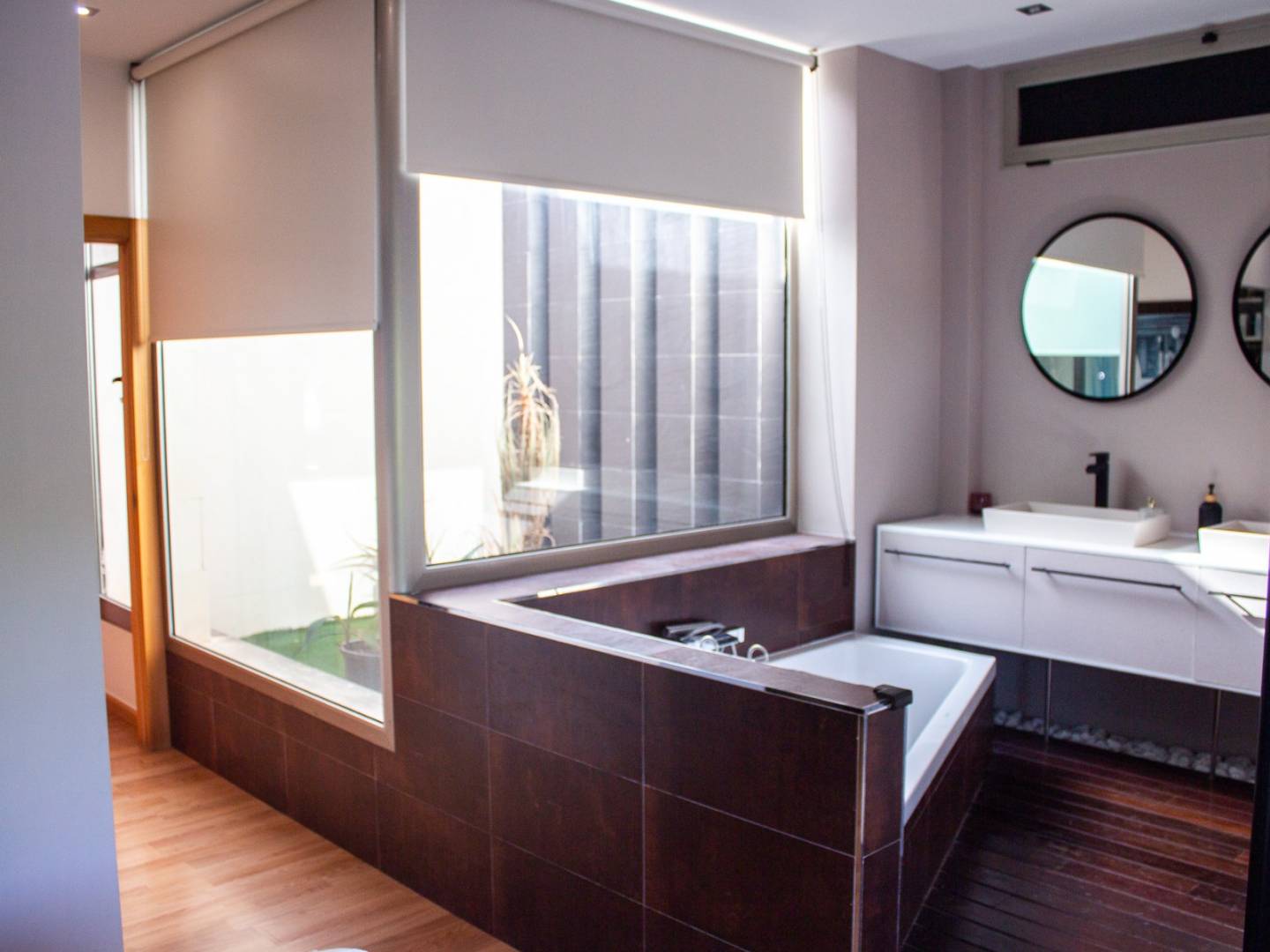 La maison comprend 5 chambres , dont une suite parentale avec dressing et salle de bains ouverte avec baignoire , donnant sur un élégant jardin intérieur baigné de lumière naturelle et agrémenté de verdure. On y trouve également deux autres chambres lumineuses, une salle de bains complète et des toilettes invités. Au total, la propriété dispose de 3 salles de bains complètes et de toilettes invités , réparties sur ses différents étages.