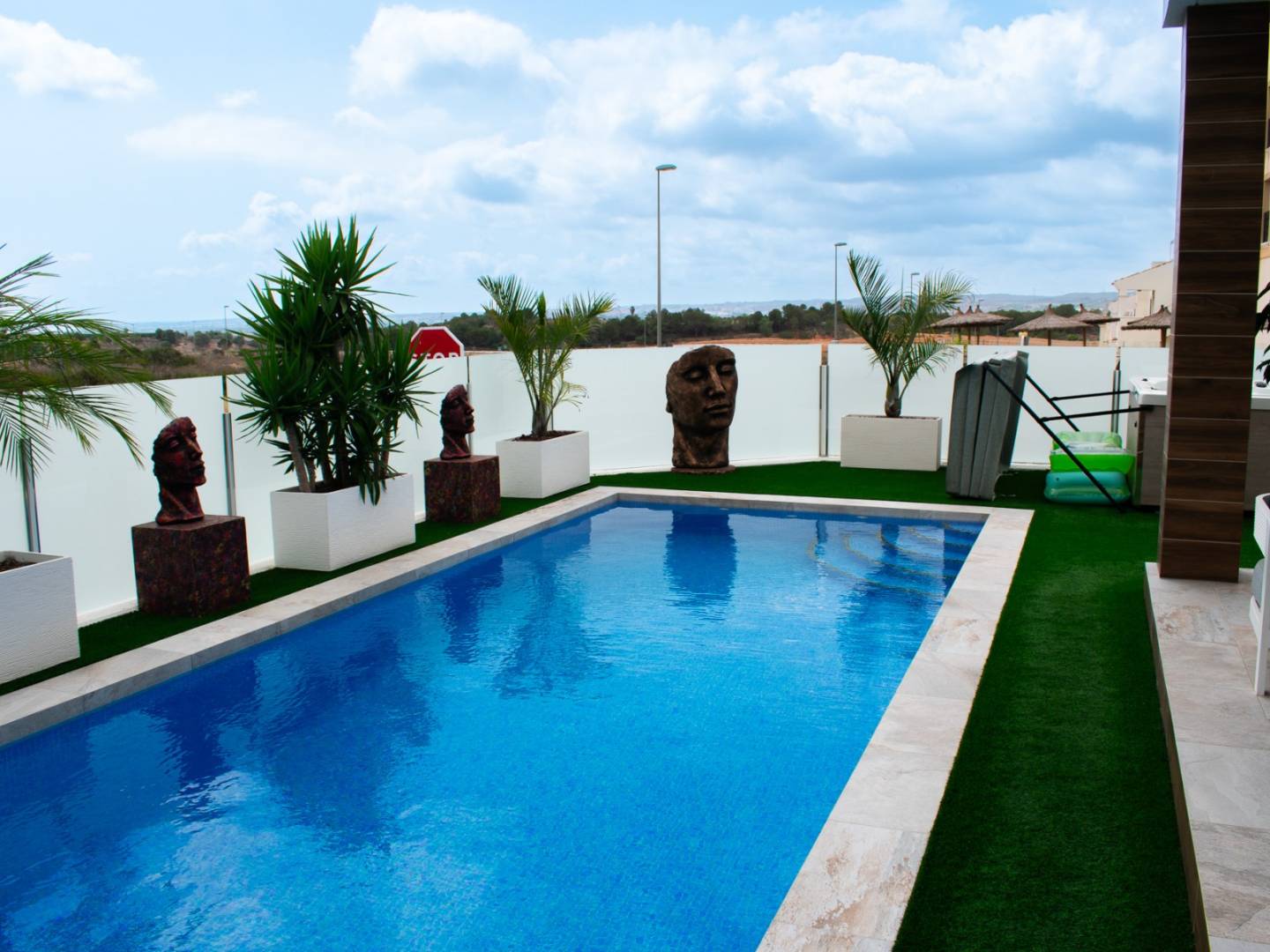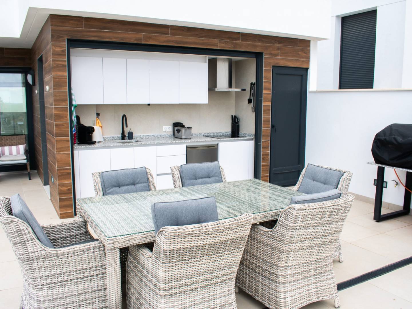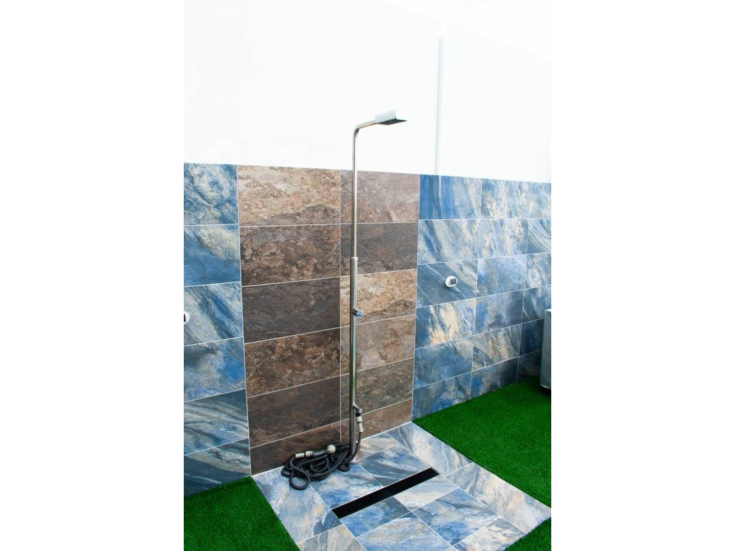 À l'extérieur, la villa offre une piscine privée d'eau salée , du gazon synthétique et une grande terrasse à l'étage équipée d' une table à manger et d' une cuisine extérieure , idéale pour les repas en plein air. Elle est également dotée de panneaux solaires pour une efficacité énergétique optimale et d'un cellier pour un rangement supplémentaire.